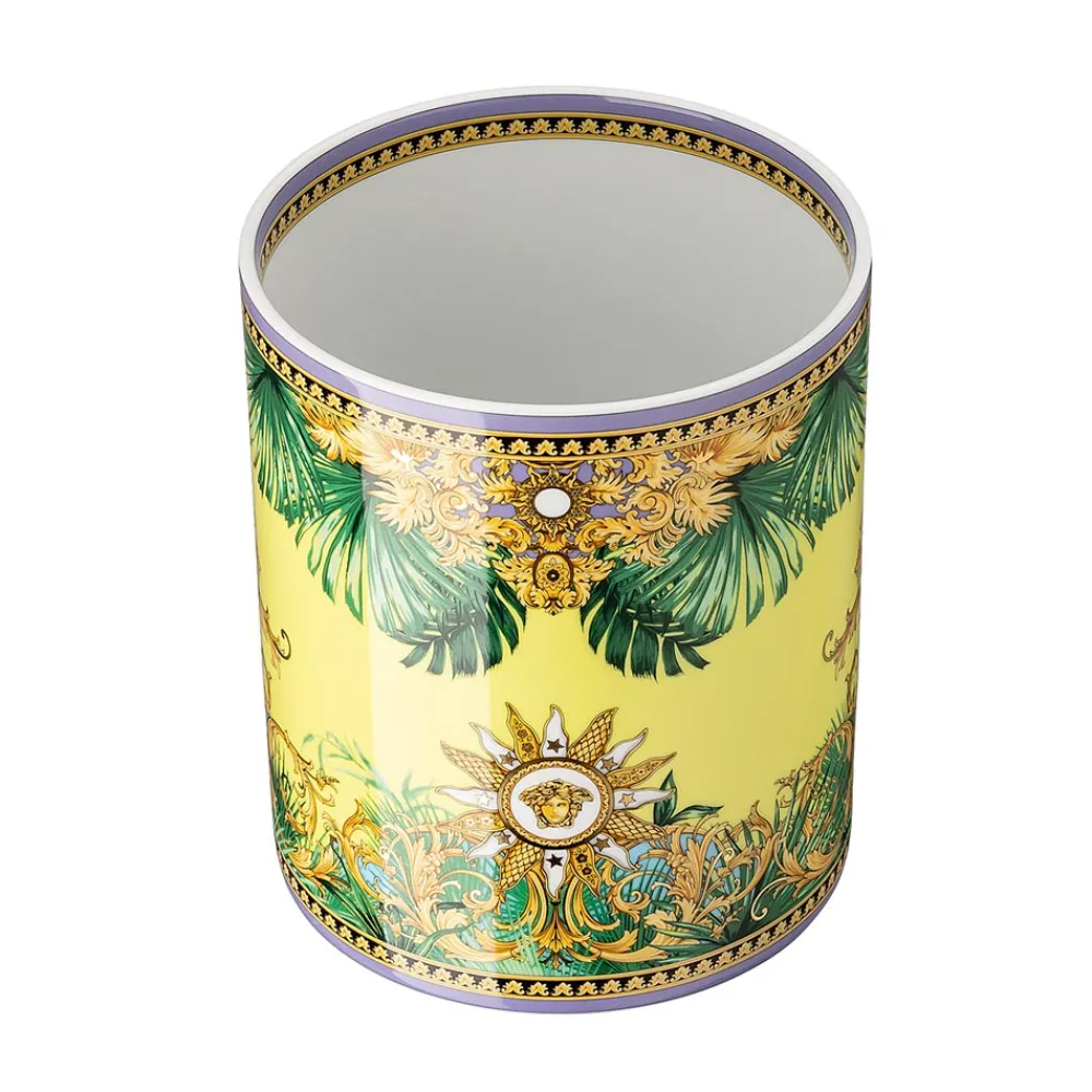 Die Jungle Animalier Vase von Versace aus feinem Porzellan ist ein Meisterwerk, das exotische Eleganz und zeitlosen Luxus vereint. Das atemberaubende Design zeichnet sich durch ein leuchtendes Gelb aus, geschmückt mit tropischen Motiven aus üppigem Blattwerk und aufwendigen barocken Details, alles umrahmt vom legendären Medusa -Symbol in der Mitte, in eine strahlende Sonne eingebettet und mit goldenen Details verziert.