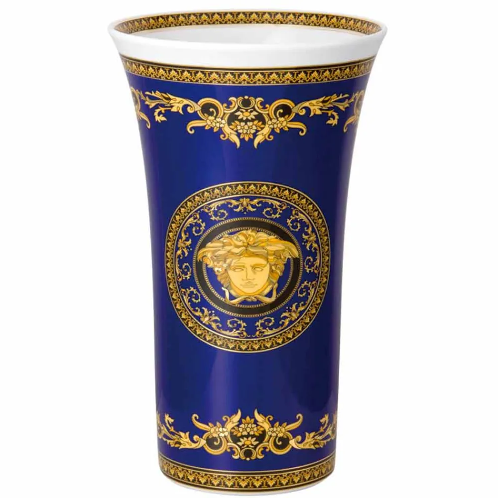 Die fabelhafte 34 cm große Designervase von Versace ist Teil der eleganten modernen Kollektion, die, kombiniert mit einem faszinierenden und raffinierten Glamour, an vergangene Epochen erinnert und in dem leuchtenden Blauton zum Ausdruck kommt und den Namen Medusa Blue trägt.