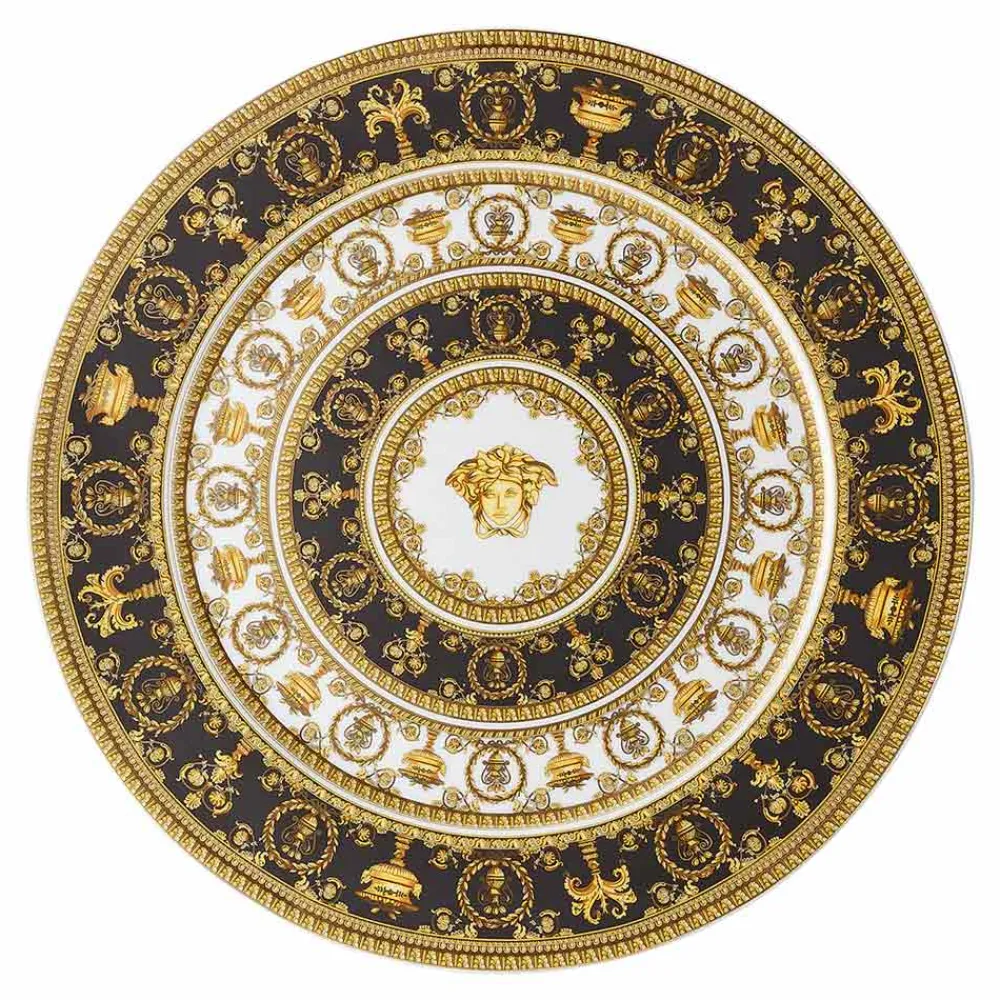 Das Tischset I Love Baroque von Versace aus kostbarem Porzellan ist ein wahres Meisterwerk zeitloser Eleganz und Raffinesse . Sein aufwendiges Design zeichnet sich durch reiche goldene Barockdetails aus, die sich harmonisch auf einem schwarz-weißen Hintergrund verflechten und einen visuellen Effekt exklusiven Luxus erzeugen. Das ikonische Gesicht der Medusa , das unverwechselbare Symbol des Hauses, sticht in der Mitte hervor, umrahmt von ornamentalen Motiven, die seine Erhabenheit unterstreichen.