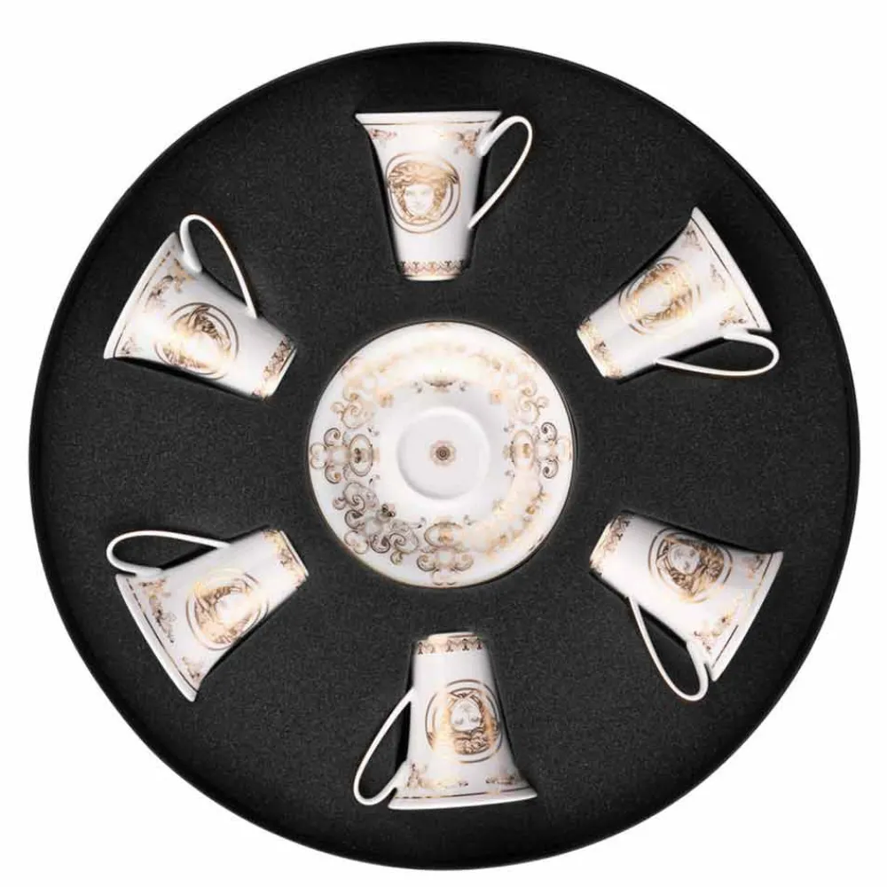 Dieses Set aus 6 Tassen enthält die ganze Raffinesse und den Luxus der neuen Medusa Gala- Tischkollektion, die die traditionellen Versace- Motive in Design und Dekoration neu interpretiert: Die Ikone der Medusa wechselt sich mit raffinierten barocken Ornamenten in kostbarem Goldfiligran ab. Ein aufregender Kontrasteffekt zwischen der Klarheit des Porzellans und dem reinen Gold erweckt eine perfekte Inszenierung zum Leben, modern und zugleich einzigartig.
