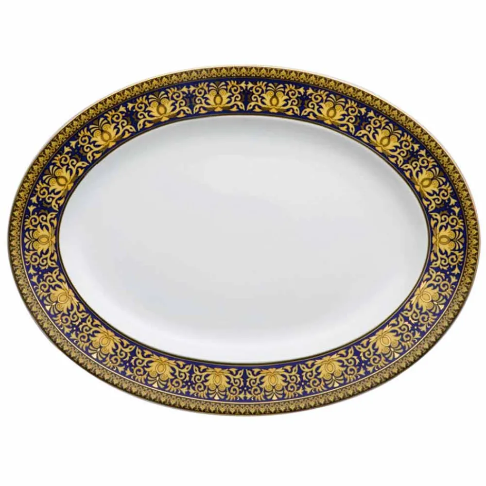 Der fantastische und moderne ovale Teller im Format 40,5 x 30 cm von Versace ist Teil der eleganten modernen Kollektion, die, kombiniert mit einem faszinierenden und raffinierten Glamour, an vergangene Epochen erinnert und in dem leuchtenden Blauton Medusa Blue zum Ausdruck kommt.