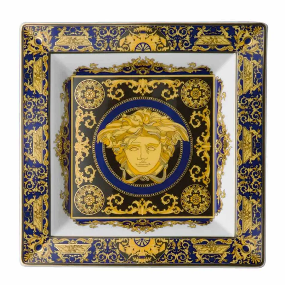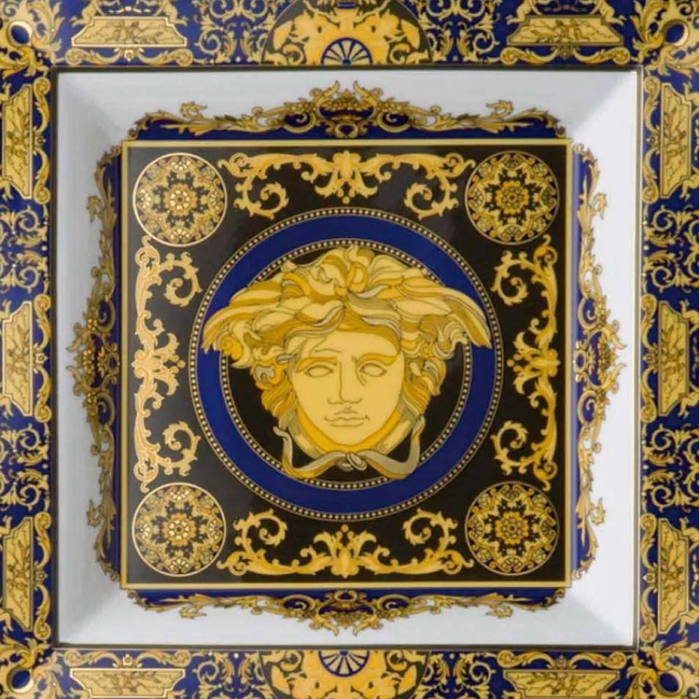 Das Highlight dieser Kollektion ist ein prächtiges goldenes Medusenhaupt, das unverwechselbare Markenzeichen von Versace, umgeben von ausdrucksstarken barocken Verzierungen. Das Medusenhaupt ist – in der Mitte – auf allen Tassen und Kannen sowie auf allen großen und kleinen Tellern der „Medusa“-Kollektion präsent. Echte Adelsfarben – leuchtendes Rot, elegantes Gold und Schwarz – und aufwendige filigrane Muster und Ornamente verleihen dem Medusenhaupt einen prächtigen Farbrahmen von beispielloser Eleganz. Die „Medusa“-Kollektion umfasst ein komplettes Tafelservice und ein Kaffeeservice sowie zahlreiche Accessoires. Große Frühstückstassen für Cappuccino und Latte, Suppenteller und Schalen gehören ebenso zur Kollektion wie wertvolle und sehr persönliche Geschenkaccessoires wie der Serviettenring, der Kerzenständer, Vasen und ein elegantes Raucherset. Die beiden Glaskollektionen „ Medusa Lumière“ und „Méandre“ sowie die Besteckkollektion „Medusa Gold“ komplettieren die elegante, farbenfrohe Tafel im einzigartigen Stil der Versace-Welt.