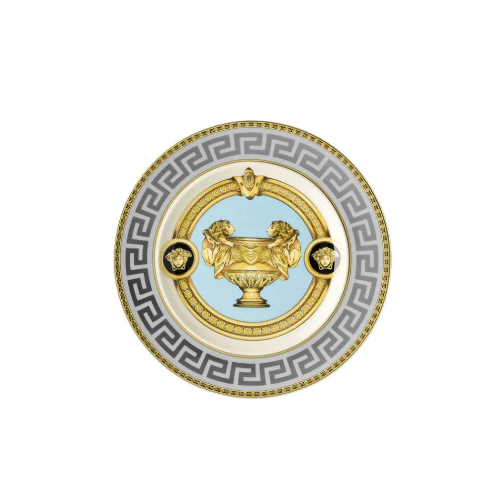 Der Versace Prestige Gala Brotteller aus feinem Porzellan ist ein perfektes Beispiel für Luxus und zeitlose Eleganz . Das raffinierte Design zeichnet sich durch eine zentrale Verzierung mit einer goldenen Amphore aus, einem Symbol für Königlichkeit und Tradition, umrahmt von einem kräftigen griechischen Motiv und goldenen Details, die die Essenz des Hauses einfangen. Erhältlich auf schwarzem oder hellblauem Hintergrund bietet er eine Stilauswahl für jeden Anlass.