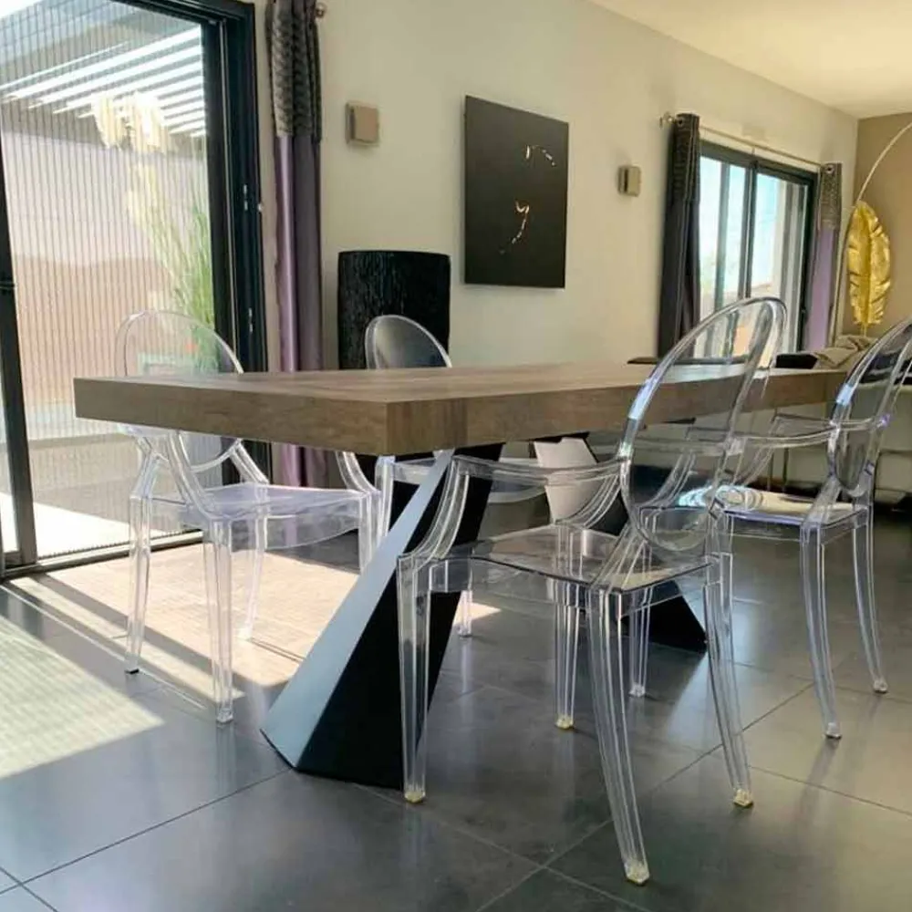 Ausziehbarer Esstisch aus Holz und Metall.