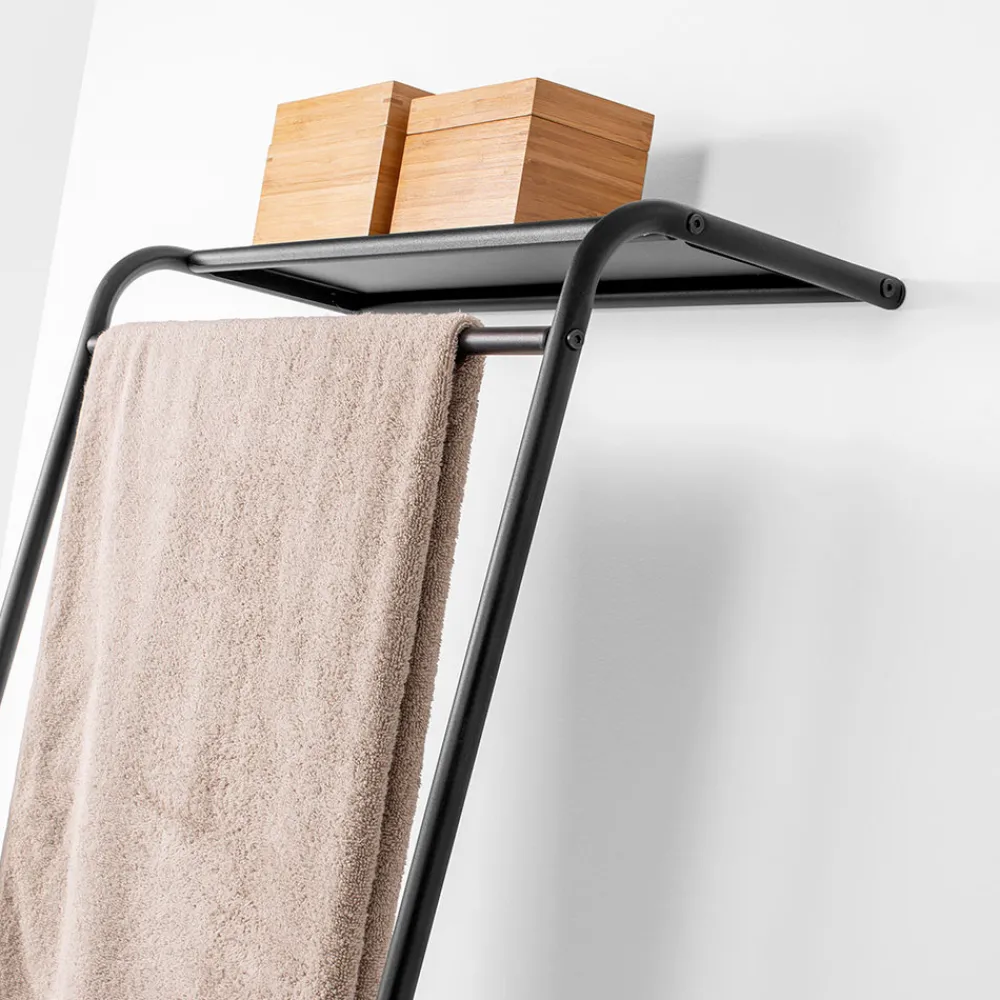 Handtuchhalter mit 3 Stangen und Hutablage aus mattschwarz lackiertem Metall .