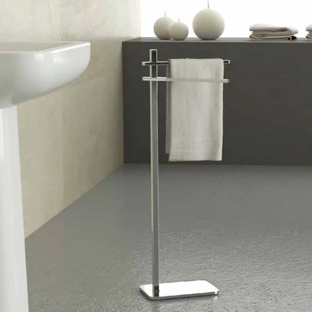 Stehlampe für Handtücher made in Italy mit 2-armiger verchromter Eisenstruktur . Dieses möblierte Accessoire mit raffiniertem Geschmack zeichnet sich durch weiche und abgerundete Linien aus und zeichnet sich durch seine unverwechselbare Einfachheit aus , die seine Eleganz und starke Persönlichkeit unterstreicht.