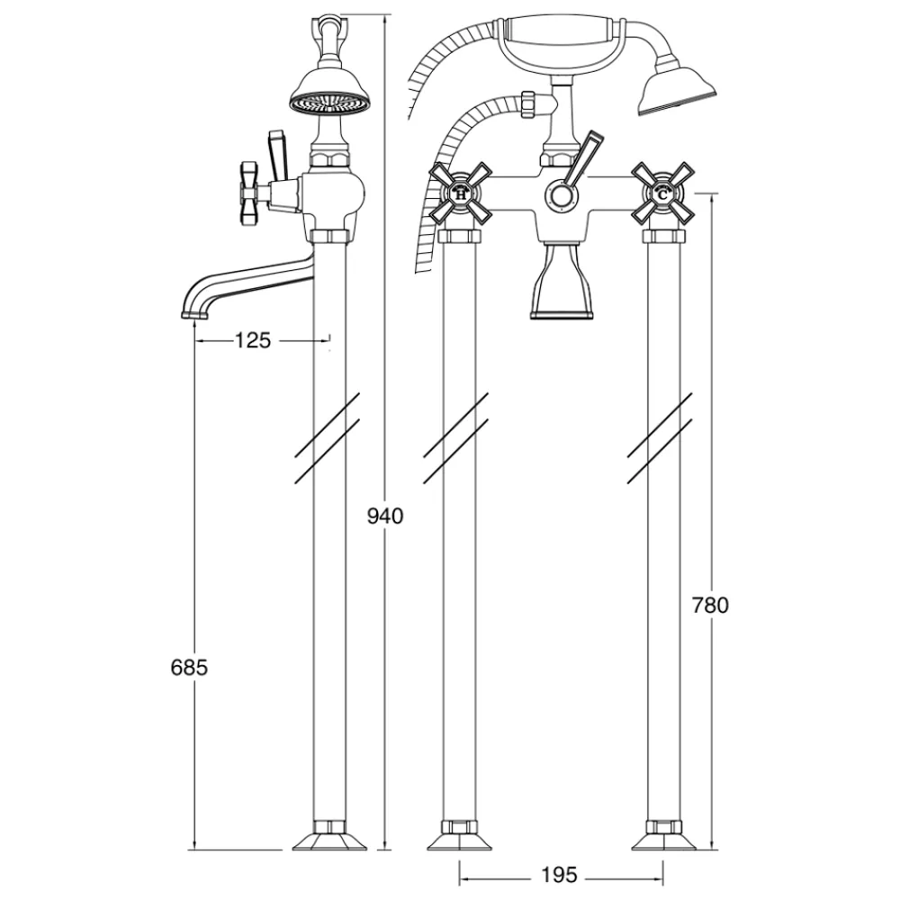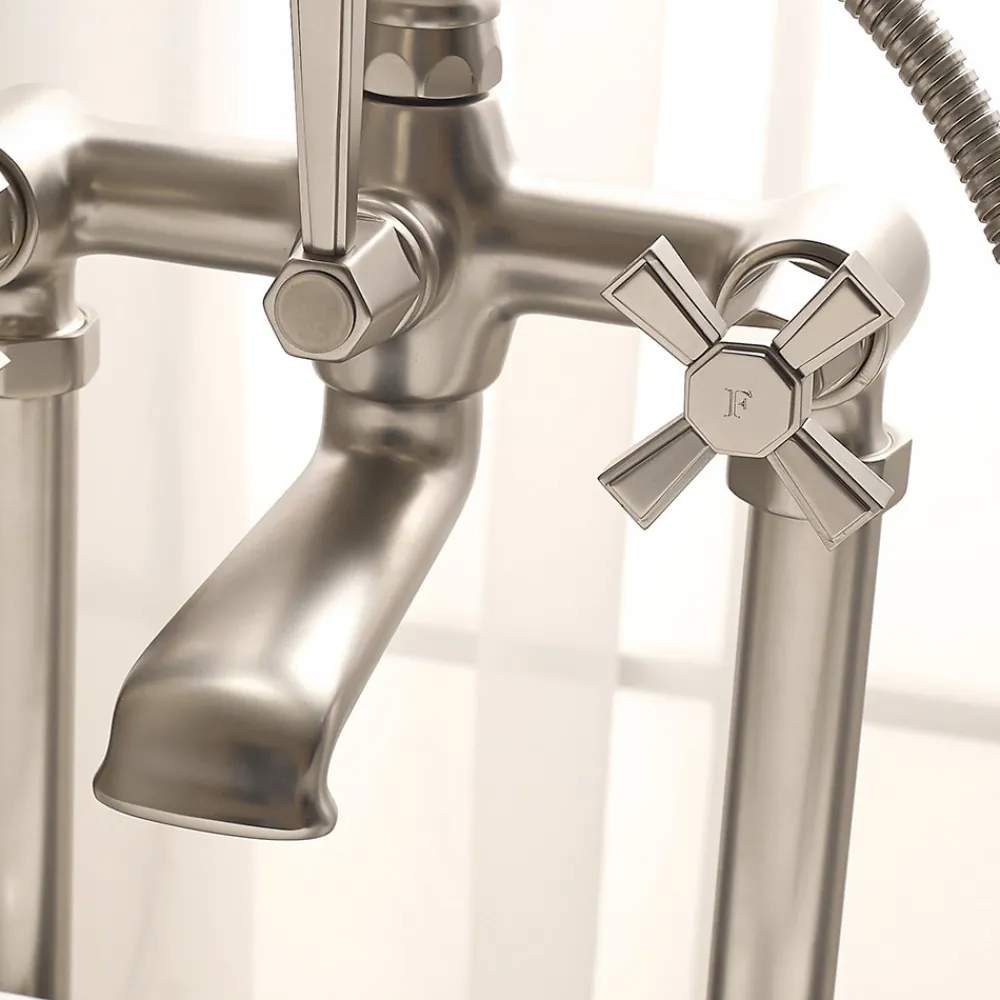 Silvana è eine kühne Bodenwannenarmatur mit Handbrause und flexiblem Schlauch, hergestellt aus Messing.