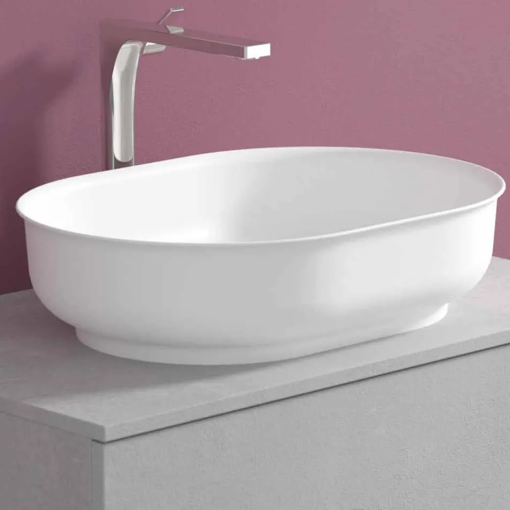 Das ovale Arbeitsplattenwaschbecken besteht aus Solid Matt, einem opaken weißen Mineralharz , und ist mit einem opaken Gelcoat versehen , der das Produkt wasserdicht macht.