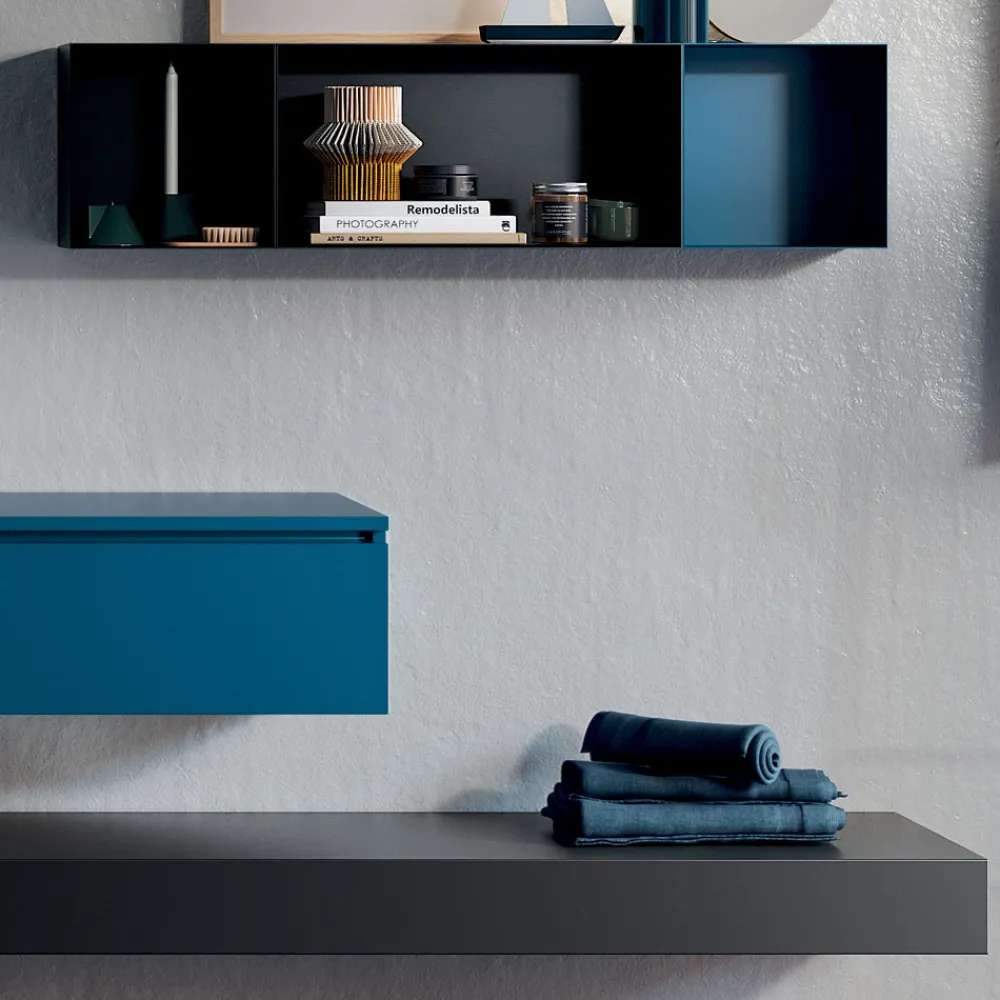 Ebenfalls im Lieferumfang enthalten sind die 4 Hängewürfel aus glänzend blau/hellblau und schwarz lackiertem Metall und die geformte Ablage vor dem Spiegel aus glänzend weißem MDF.