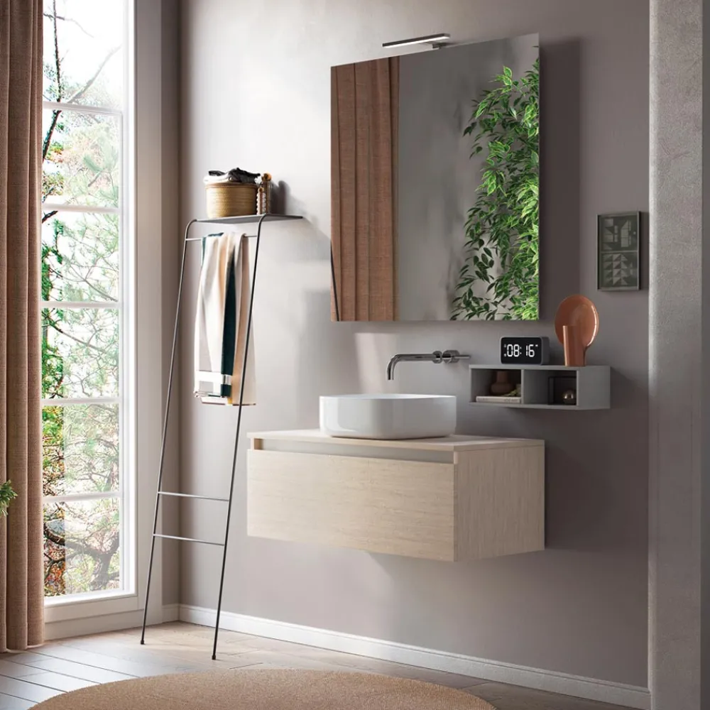 Badezimmerkomposition komplett mit kratzfestem Sockel, Spiegel und Waschbecken, hergestellt in Italien.