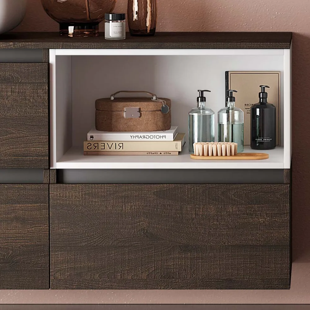 Badezimmerkomposition mit dunkelbraunem Sockel und Keramikwaschbecken „Made in Italy“.