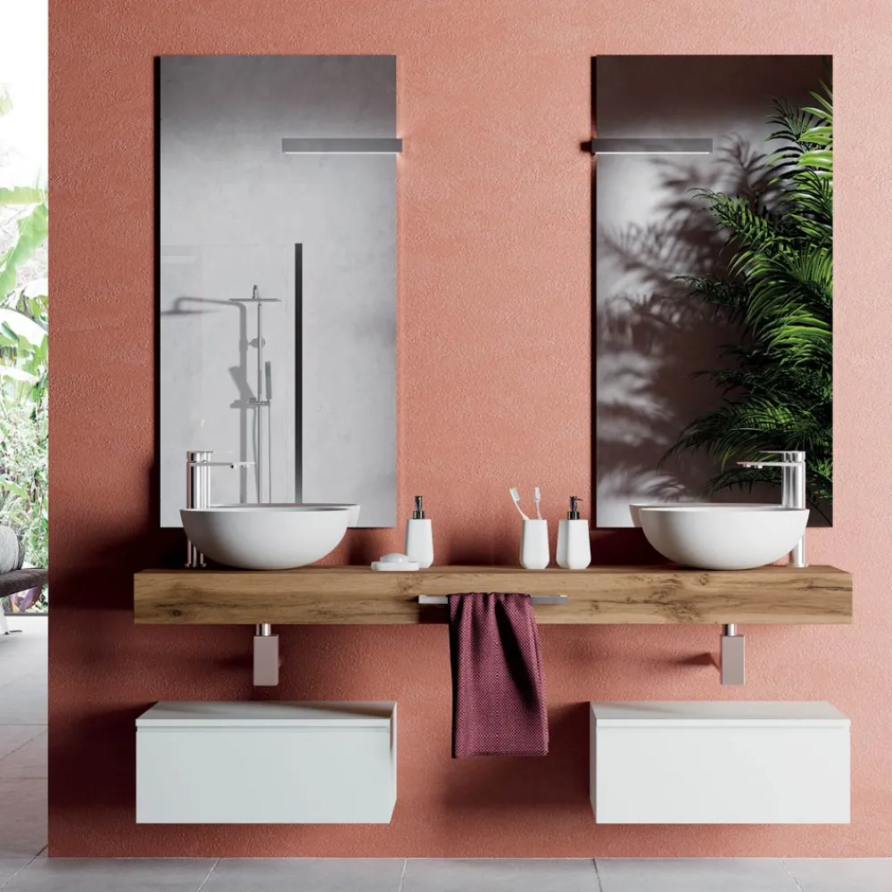 Badezimmerkomposition bestehend aus: 2 Waschbecken aus mattweißem Harz auf einer honigfarbenen Eichenplatte, 2 Untergestellen aus glänzend weißem kratzfestem Melamin und 2 Spiegeln mit LED-Lampe.