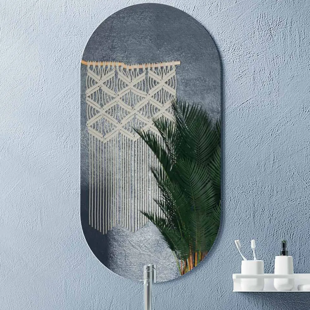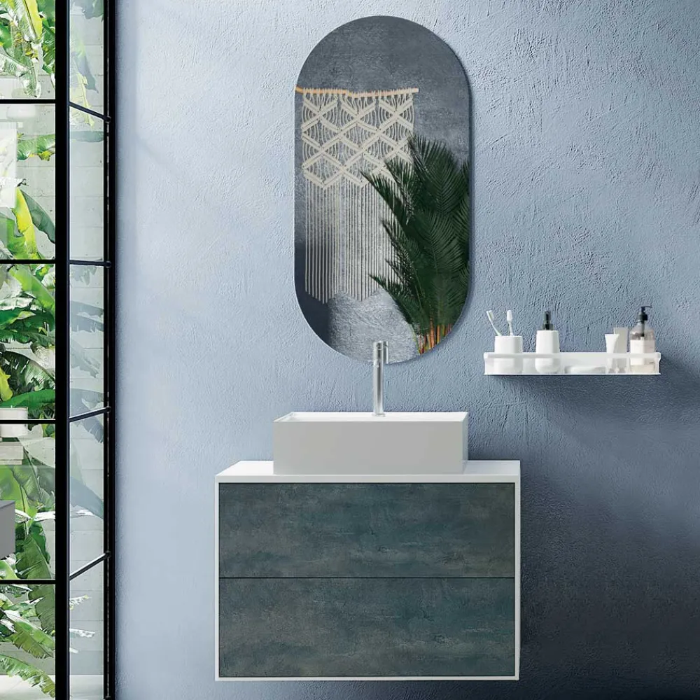 Badezimmerkomposition komplett mit ovalem Spiegel, Keramikwaschbecken und Unterbau „Made in Italy“.