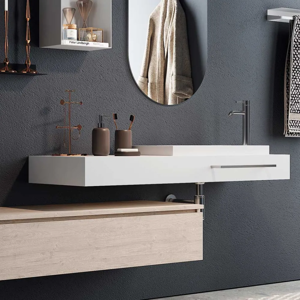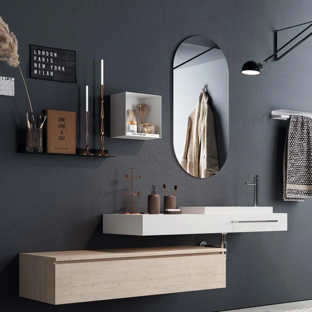 Badezimmerkomposition aus italienischer Herstellung, bestehend aus einem ovalen Glasspiegel , Sockel aus kratzfestem Melamin in natürlicher Eichenfarbe, mit vollständig herausziehbarer Metallschublade und Soft-Close-Verschluss . Oberseite aus beschichtetem MDF und glänzend weißem HPL, auf der ein Waschbecken aus weißem Harz ruht.