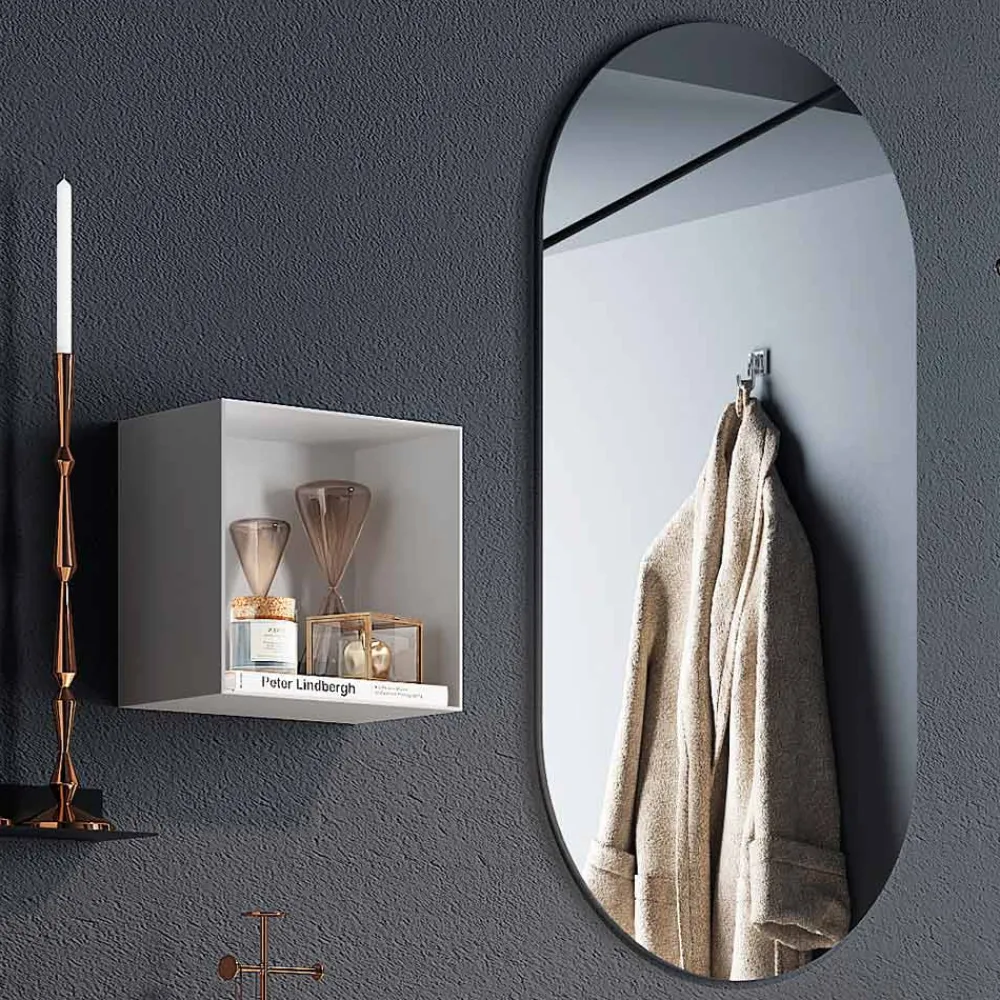 Badezimmerkomposition komplett mit ovalem Spiegel, Waschbecken und kratzfestem Sockel. Made in Italy.