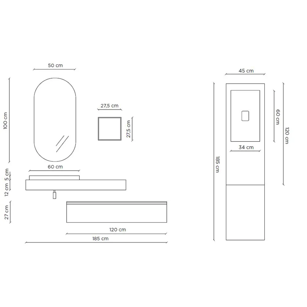 Badezimmerkomposition im modernen und minimalistischen Stil, die den Bedürfnissen all derer gerecht wird, die ihr Badezimmer mit Geschmack und Raffinesse einrichten möchten. Die Kombination aus Materialien und Farben macht diese Produkte einzigartig und garantiert die Qualität und Beständigkeit, die alle Badmöbel auszeichnen.