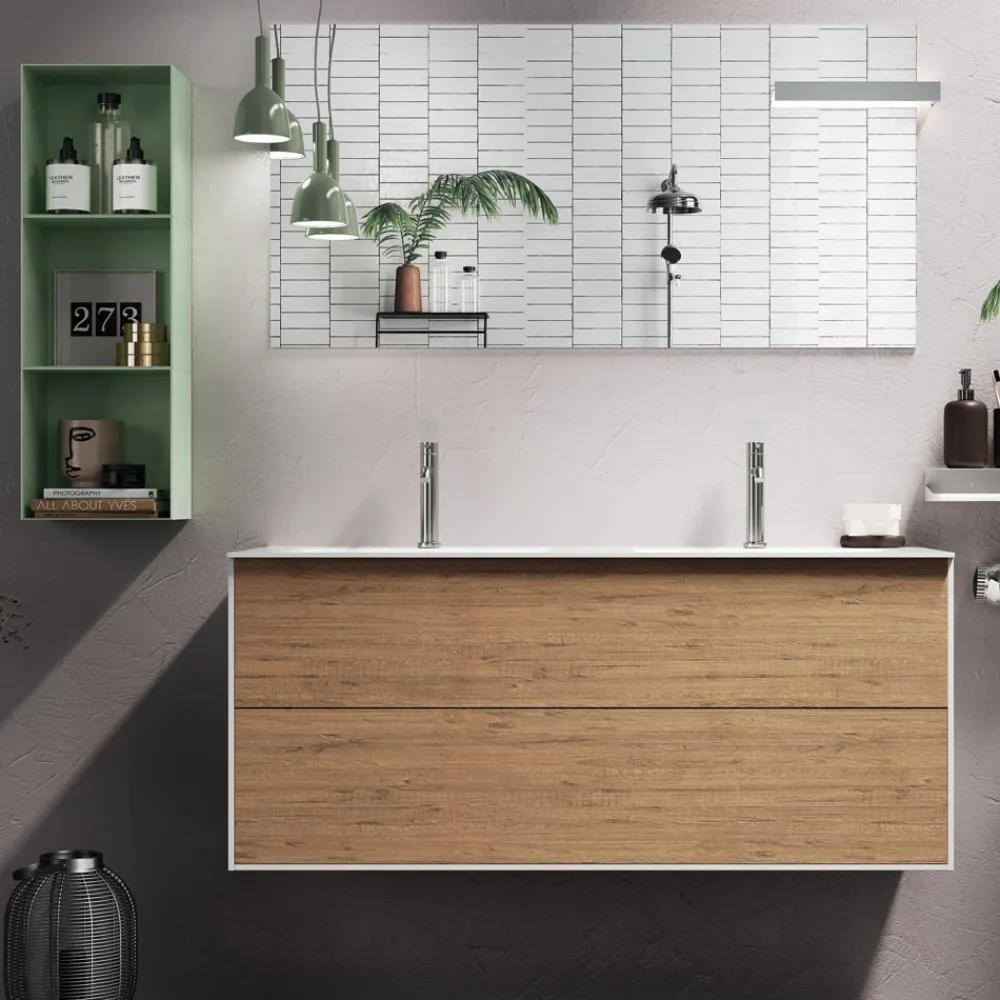 Badezimmerkomposition mit Sockel aus kratzfestem Melamin in der Farbe Honigeiche mit 2 voll ausziehbaren Schubladen und Soft-Close-Verschluss , rechteckigem Spiegel mit Lampe und Doppel-Konsolenwaschbecken aus glänzend weißer Keramik .
