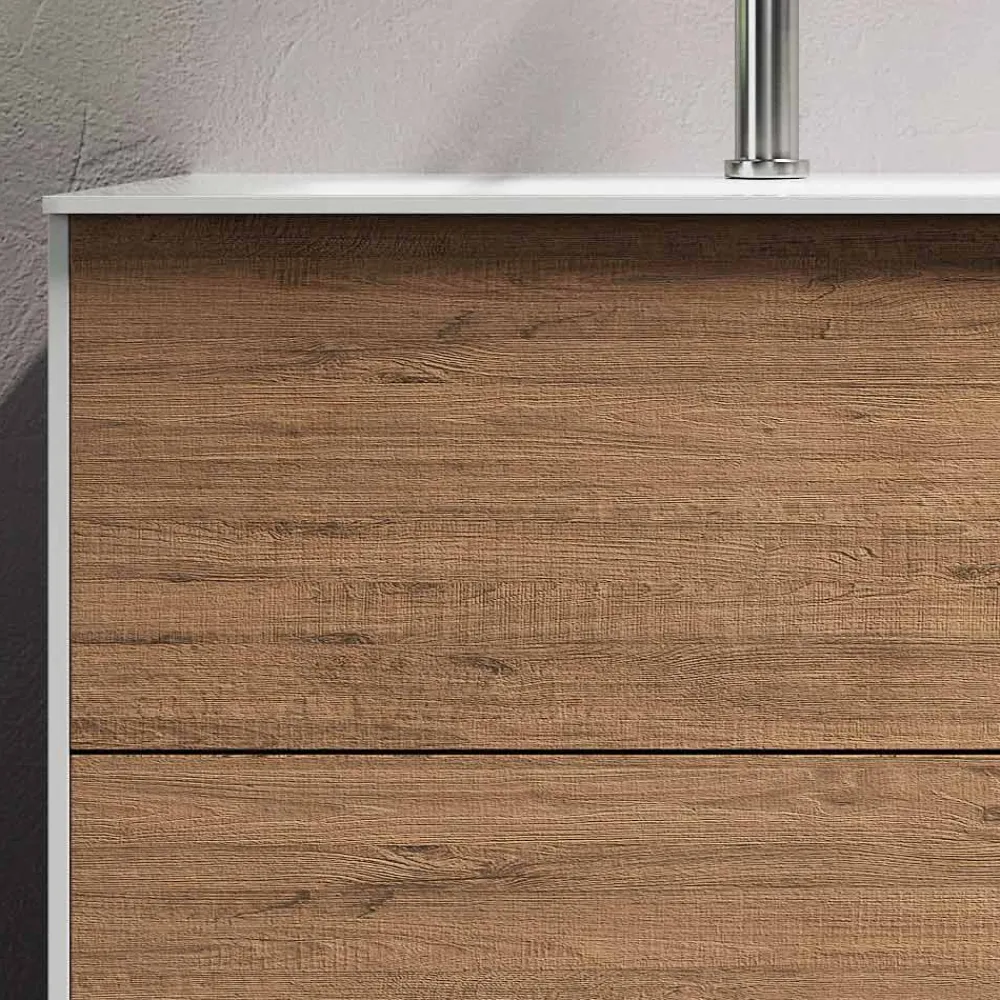 Badezimmerkomposition in Eichenholzfarbe mit Sockel, Spiegel und Waschbecken aus Keramik „Made in Italy“