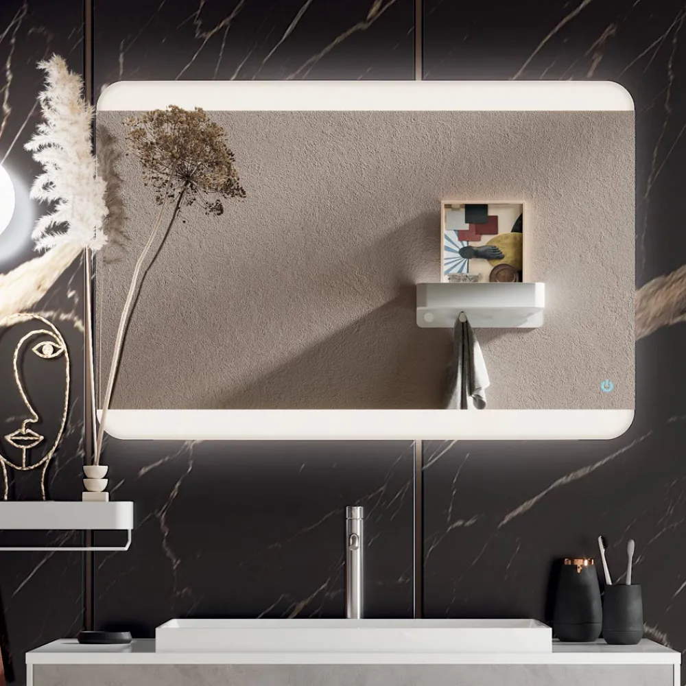 Badezimmerkomposition komplett mit eingebautem Waschbecken aus Kunstharz, Glasspiegel mit LEDs an der Vorder- und Rückseite und Basis aus kratzfestem Melamin in Zementfarbe mit 2 vollständig ausziehbaren Schubladen und Soft-Close-Verschluss.