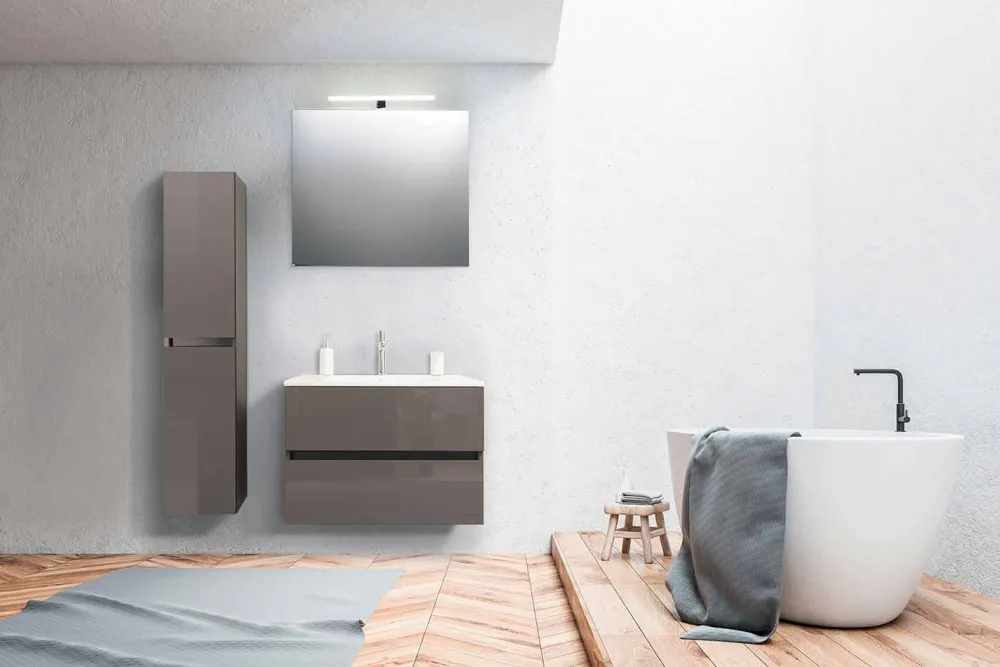Badezimmerschrank 80 cm, Säule, Waschbecken und Designspiegel.