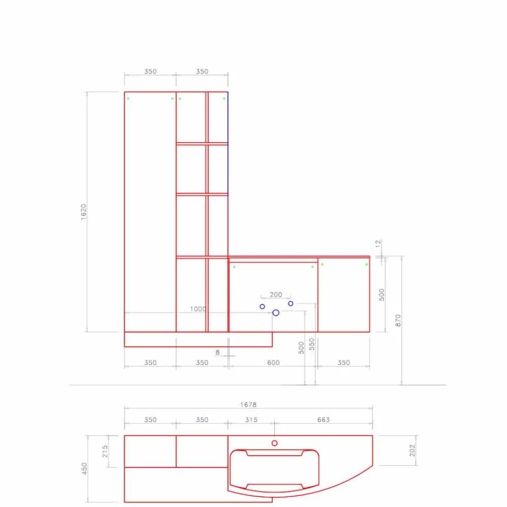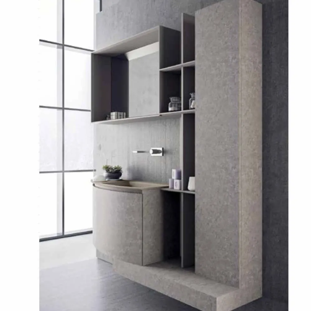 Diese formale Klarheit wird durch die Rillentür mit einem geneigten Profil gegeben. Die Besonderheit dieser Zusammensetzung wird durch das eingebaute Waschbecken gegeben, das durch zwei seitliche Seiten gekennzeichnet ist, die sanft zum Becken hin abfallen, und durch die gekrümmte Wandeinheit, die es enthält.