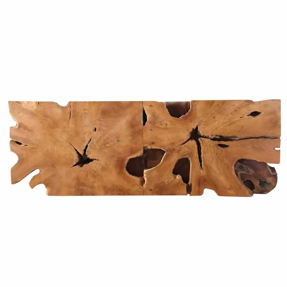 Moderne Tischplatte aus massivem Teakholz, wiedergewonnen und mit Wachs behandelt. Diese Behandlung hinterlässt dem Holz einen leichten Schutz, der bei Bedarf mit Wachs oder Wachsöl wiederholt werden kann. Die Löcher und Unvollkommenheiten im Teakholz bestätigen die Natürlichkeit der Decke. Wandhalterungen nicht im Lieferumfang enthalten. Top bestehend aus Abschnitten aus massivem Teakholz, das wiedergewonnen und zusammengefügt wurde. Durch die rechteckige Form der Oberseite bleiben jedoch alle Merkmale des verwendeten Stammes bzw. der verwendeten Wurzel deutlich. Die Äste des Holzes und die Veredelung der Äste, die Unregelmäßigkeiten des Stammes und die Farbschattierungen zeichnen auf jeder Spitze einzigartige und unwiederholbare Motive.