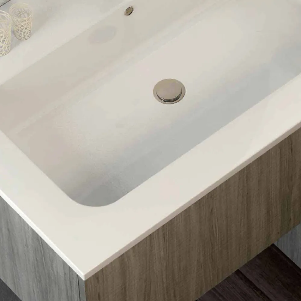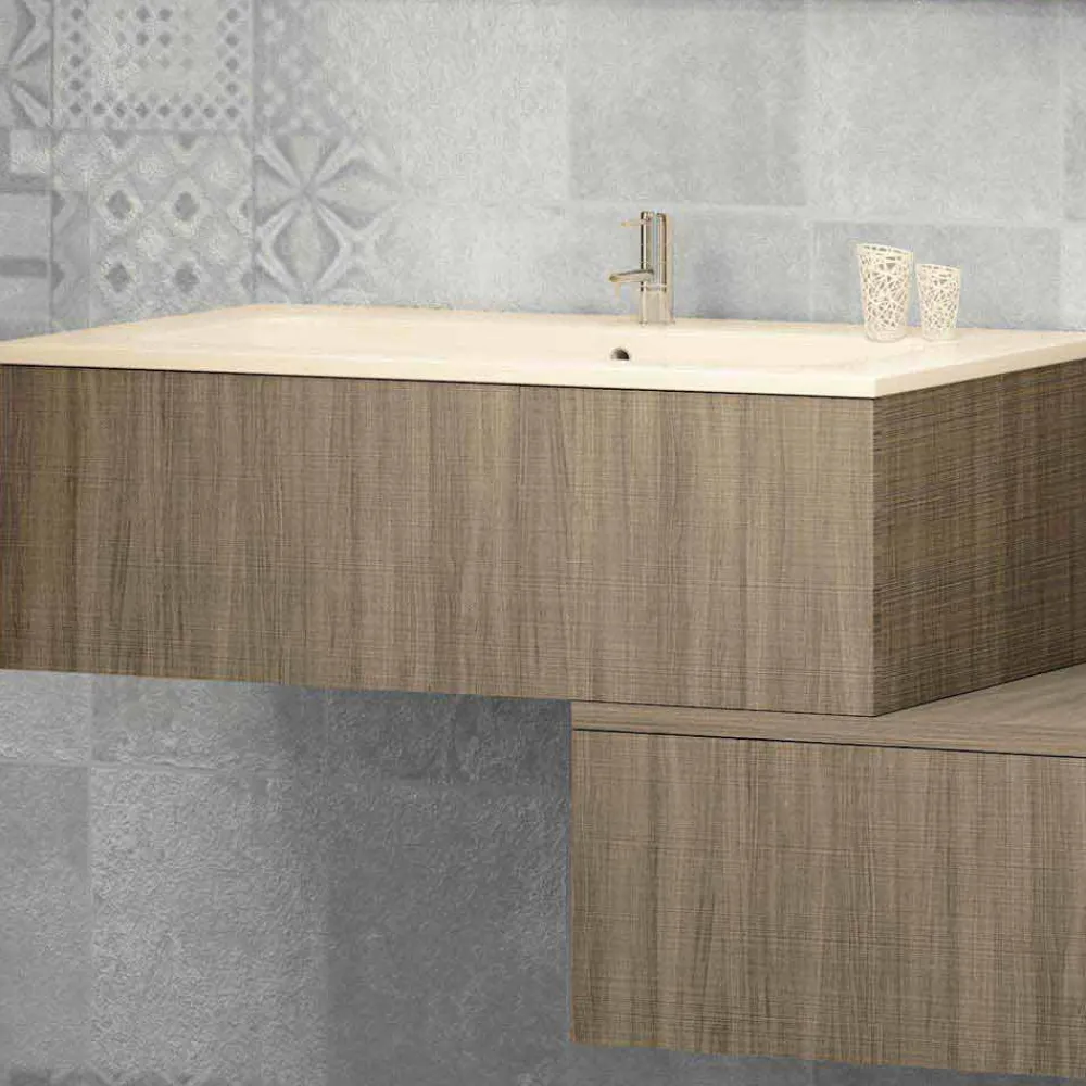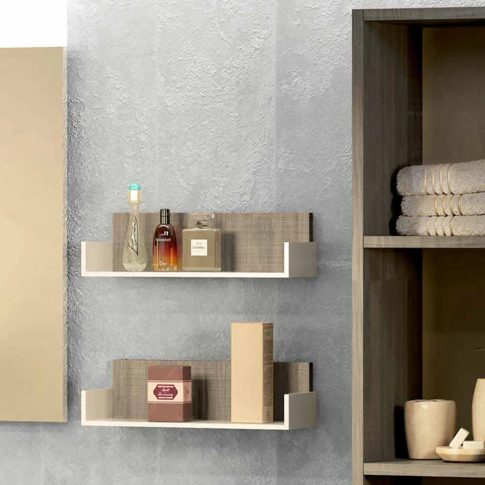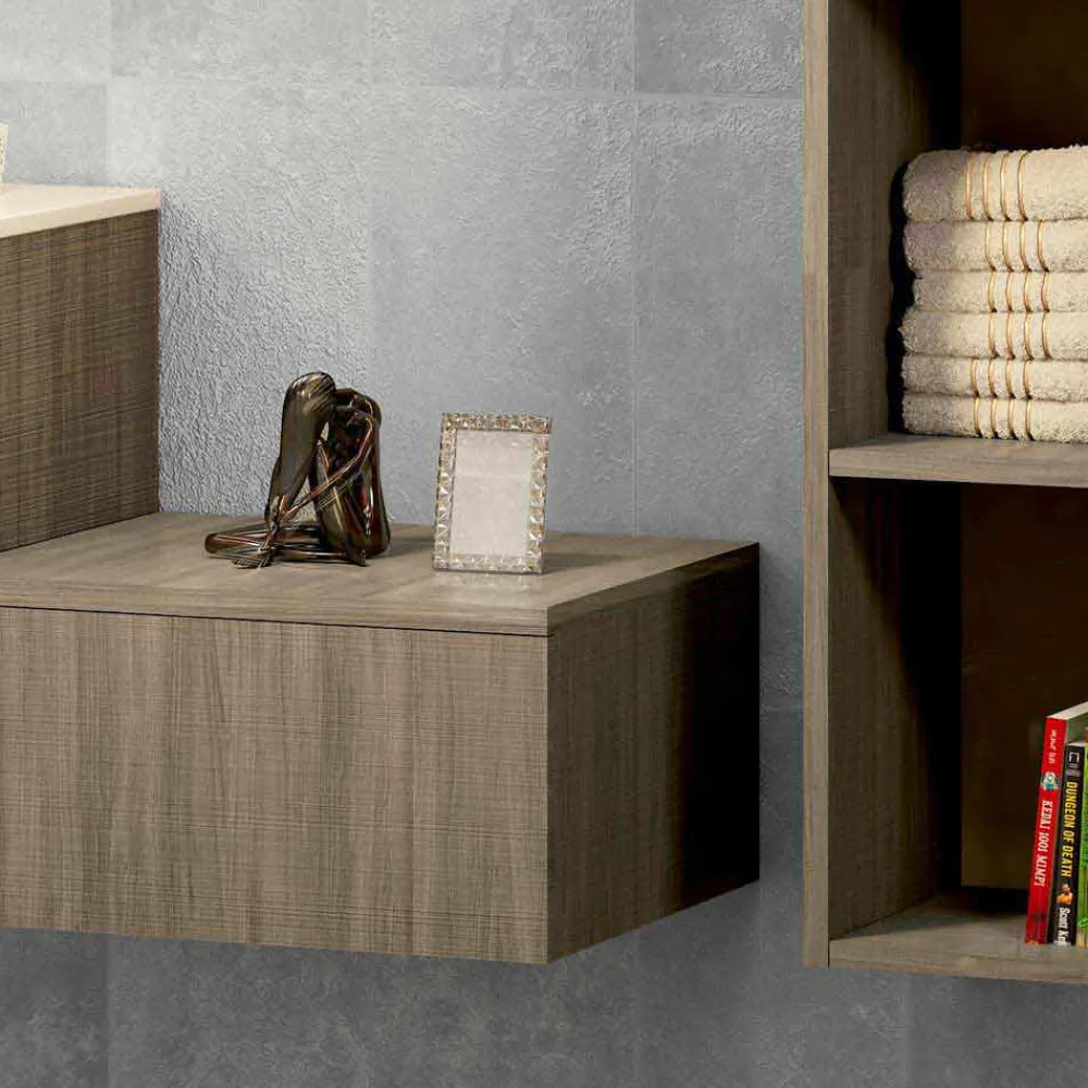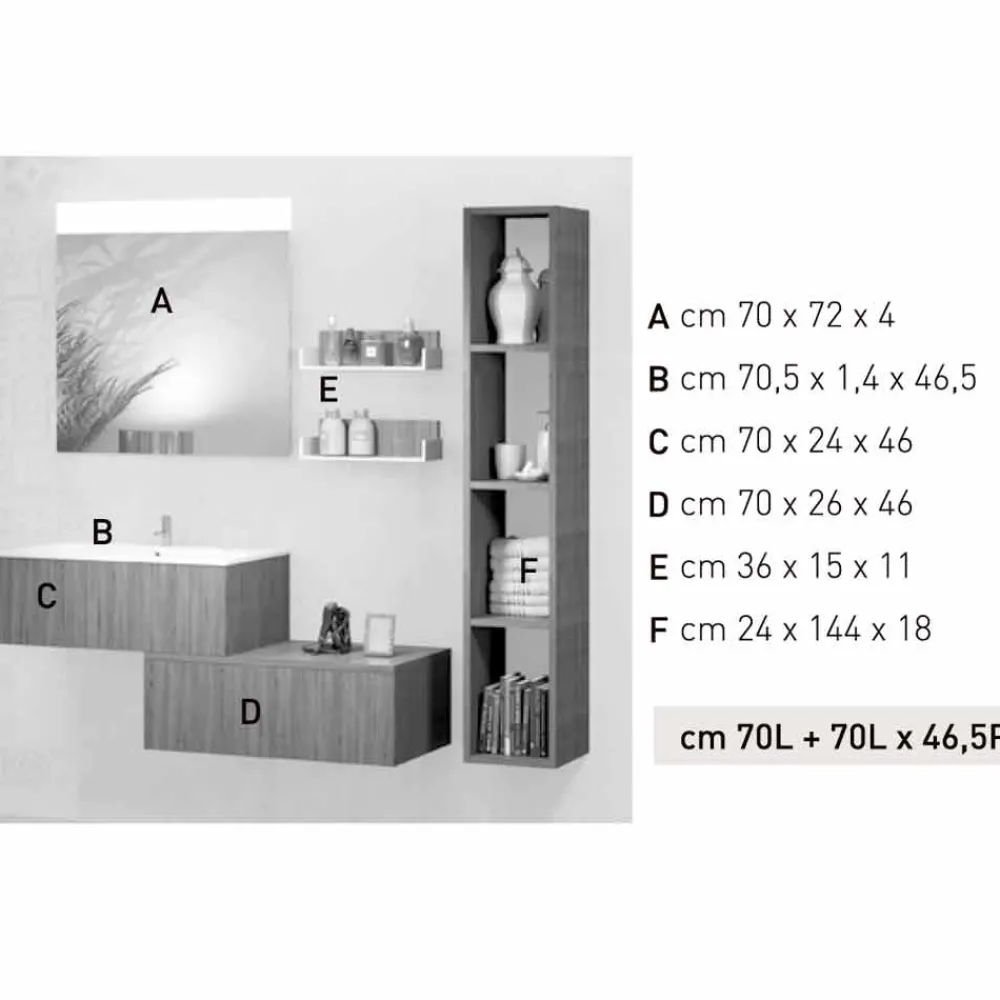 Forlì ist eine hängende Badezimmerkomposition aus Ökoholz, vollständig recycelt, vollständig recycelt und mit ungiftigem Kunststofflaminat überzogen, reproduziert perfekt die natürlichen Farben und die Maserung des Holzes. In Verbindung mit der satinierten Lackierung der Mdf-Ergänzungen ermöglicht es, eine weiche und natürliche Linie mit ungiftiger Farbe ohne Lösungsmittel zu erhalten.