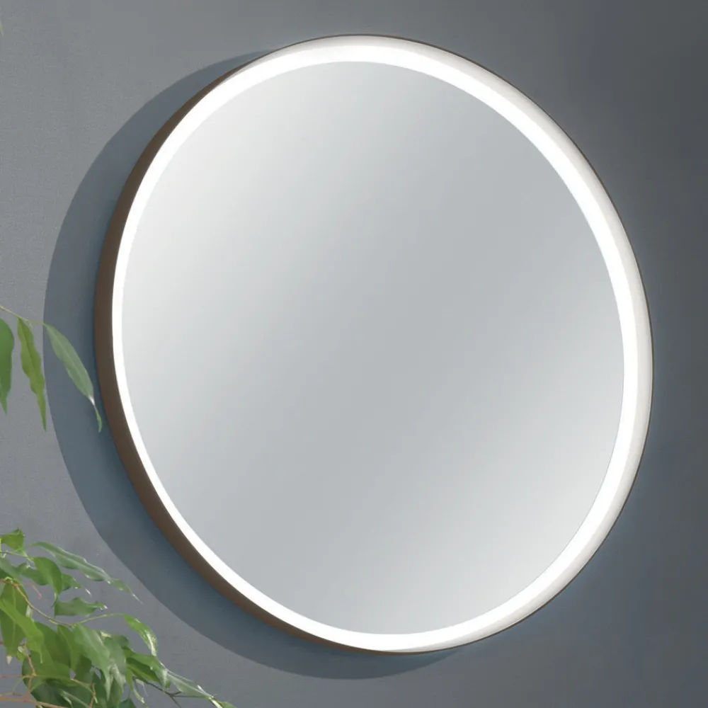 Am Ende des funktionalen Designs steht das Gesamtöffnungssystem mit Push & Pull-System und der runde Spiegel mit außenliegender Sandstrahlung und umlaufend integrierter LED-Beleuchtung , kombiniert mit einem matt patinierten bronzefarben lackierten Metallrahmen.