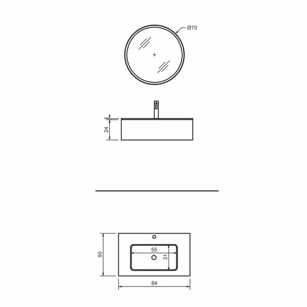 Die Badmöbel Kombination umfasst einen Waschtisch mit Schublade mit einem praktischen Push & Pull – Öffnungssystem in matt bronze lackierten MDF und eine Satin erdfarben Glasplatte mit integriertem Waschbecken.
