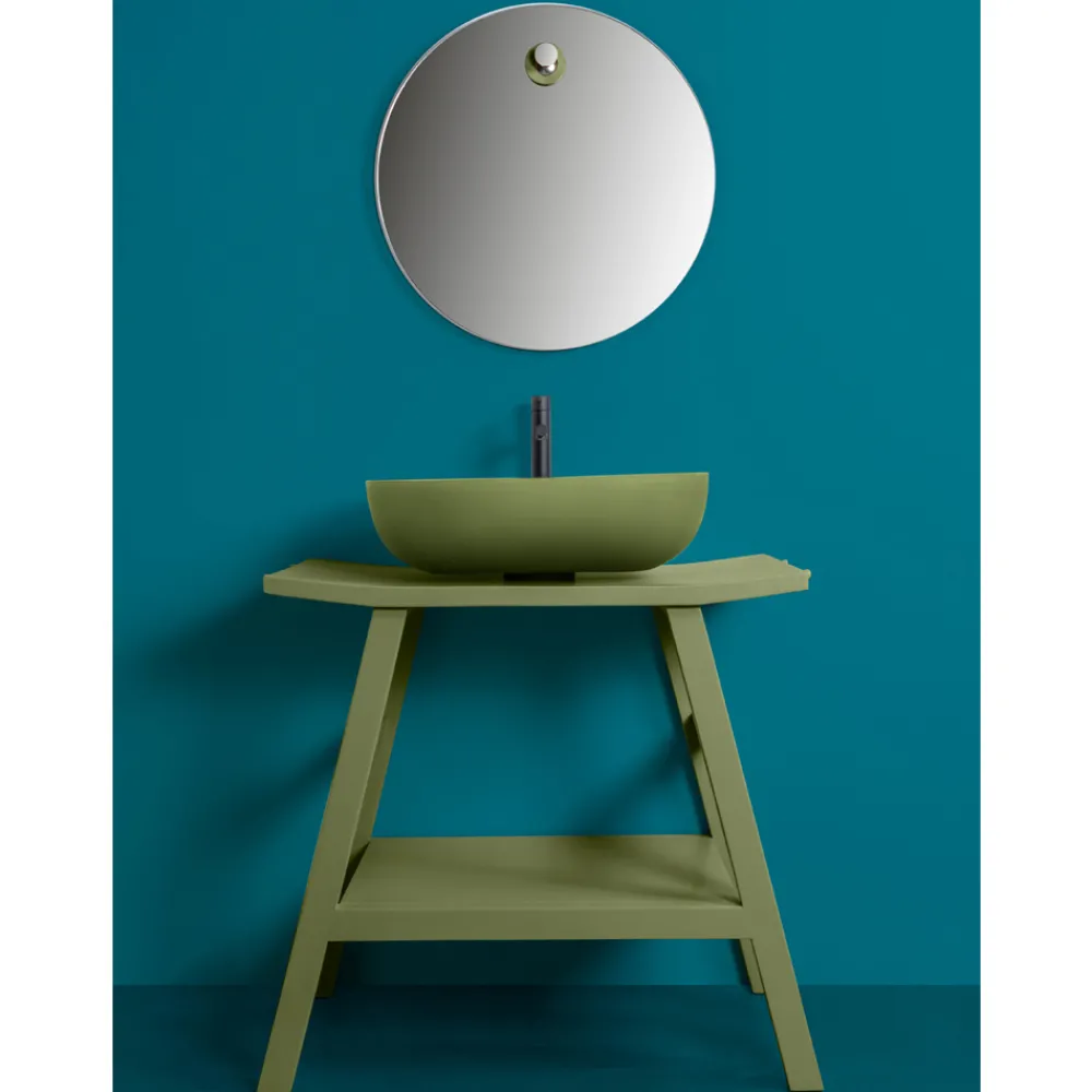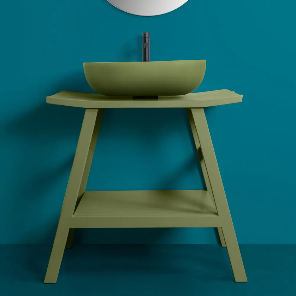 Freistehender Badezimmerschrank aus recyceltem , grün lackiertem Teakholz, ein Farbton, der in jedem Detail an den Orient erinnert. Seine Struktur zeichnet sich durch die leicht geschwungene Form der Platte aus, die der Ästhetik des Produkts eine exklusive und raffinierte Note verleiht. Komplett mit 4 praktischen Handtuchhaken und funktionaler Ablagefläche .