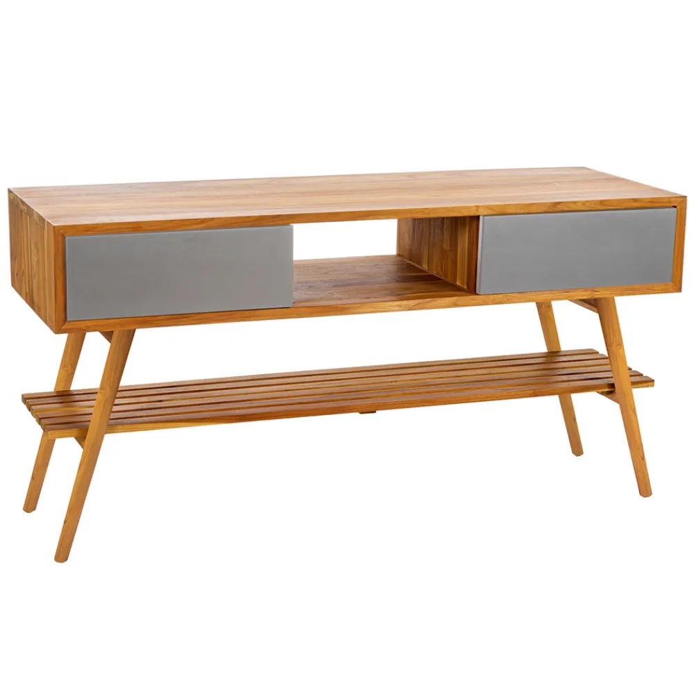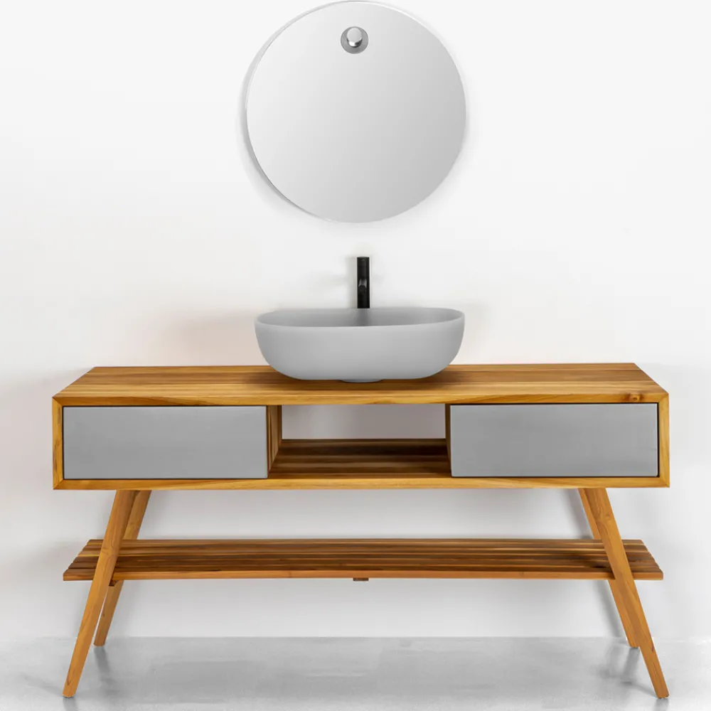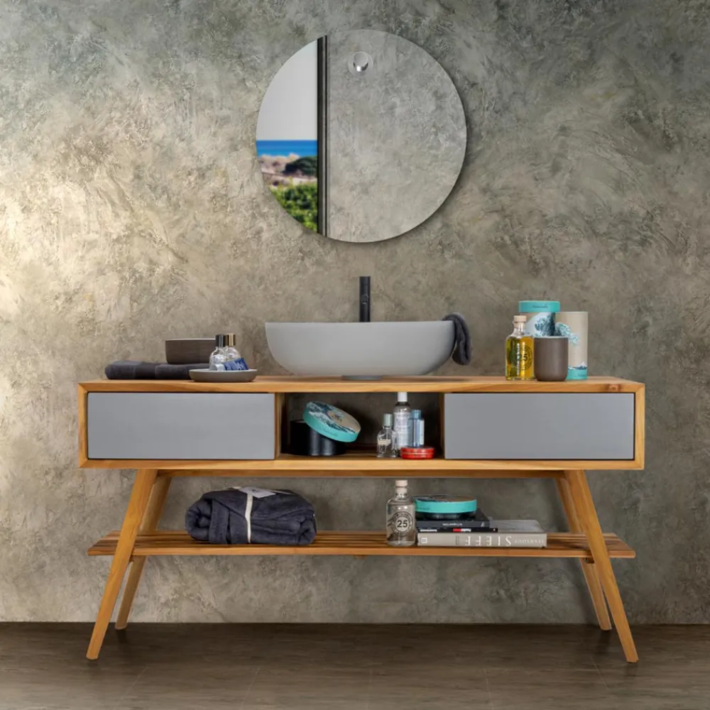 Badezimmerschrank aus natürlichem Teakholz mit doppelter Schublade aus Mahagoni.