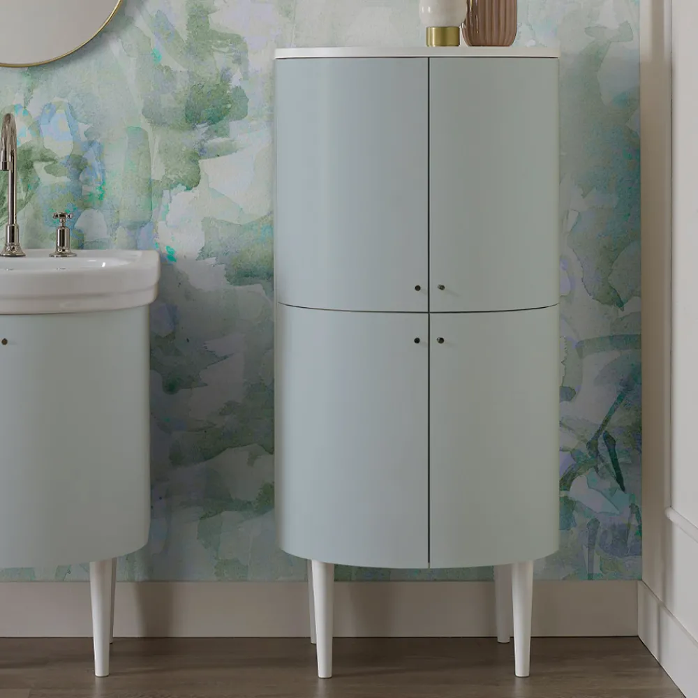 MDF-Säule mit vier Türen hellblaues, mattes Finish die drei Regale verschließen, davon zwei aus Glas und eines aus Hydro-MDF. Das obere Regal und die Beine sind in mattweißem Finish gehalten und die Knöpfe sind in Nickel- Finish enthalten.