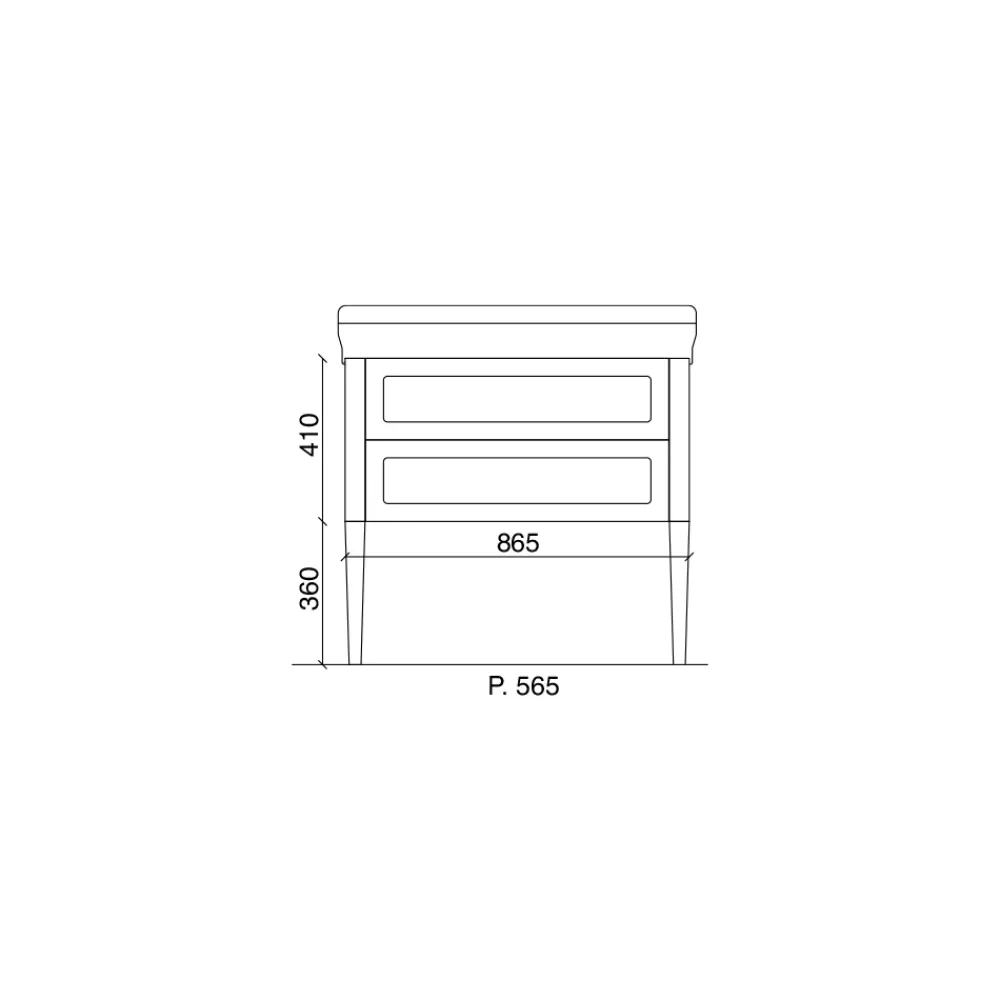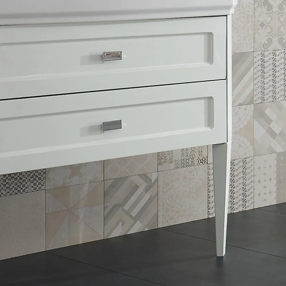 MDF-Badezimmerschrank mit zwei Schubladen und weißem Keramikwaschbecken inklusive. Rechteckige Griffe aus Nickel sind im Preis inbegriffen. Die Außenseite des Schrankes ist glänzend lackiert, die Innenseite ist matt lackiert.
