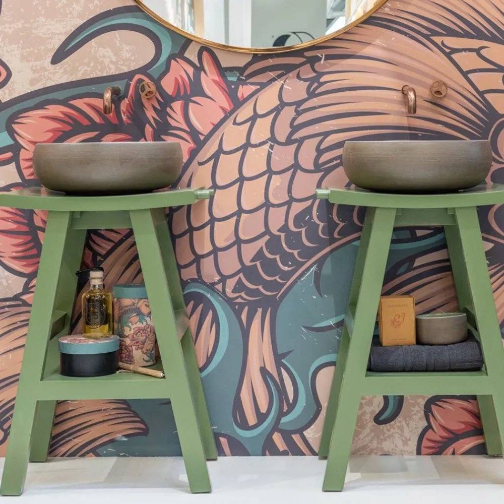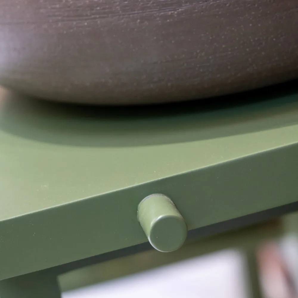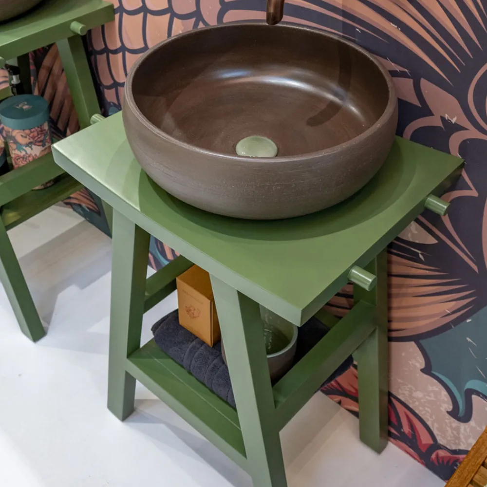 Freistehender Badezimmerschrank aus natürlichem, recyceltem , grün lackiertem Teakholz, ein Farbton, der in jedem Detail an den Orient erinnert. Seine Struktur zeichnet sich durch die leicht geschwungene Form der Platte aus, die der Ästhetik des Produkts eine exklusive und raffinierte Note verleiht. Komplett mit 4 praktischen Handtuchhaken und funktionaler Ablagefläche .