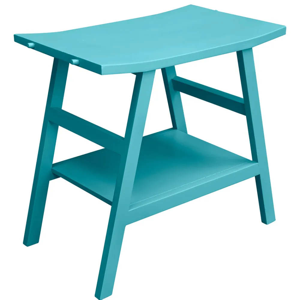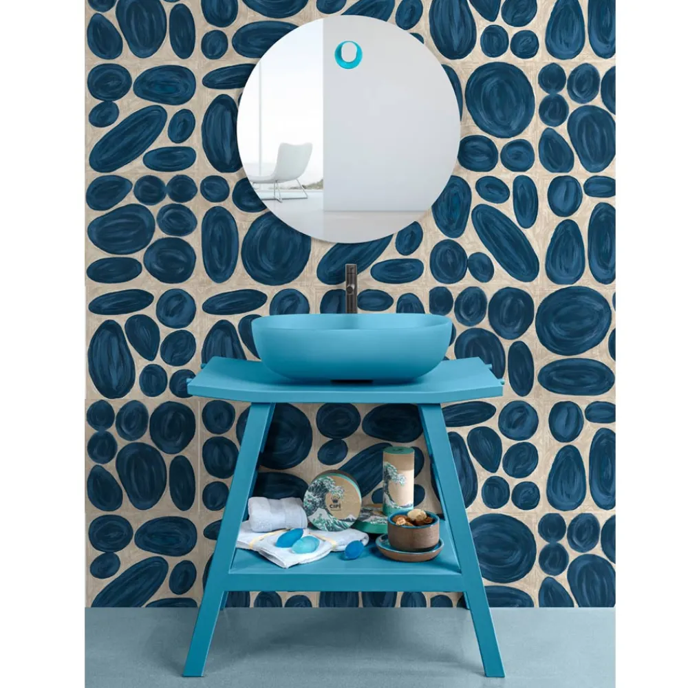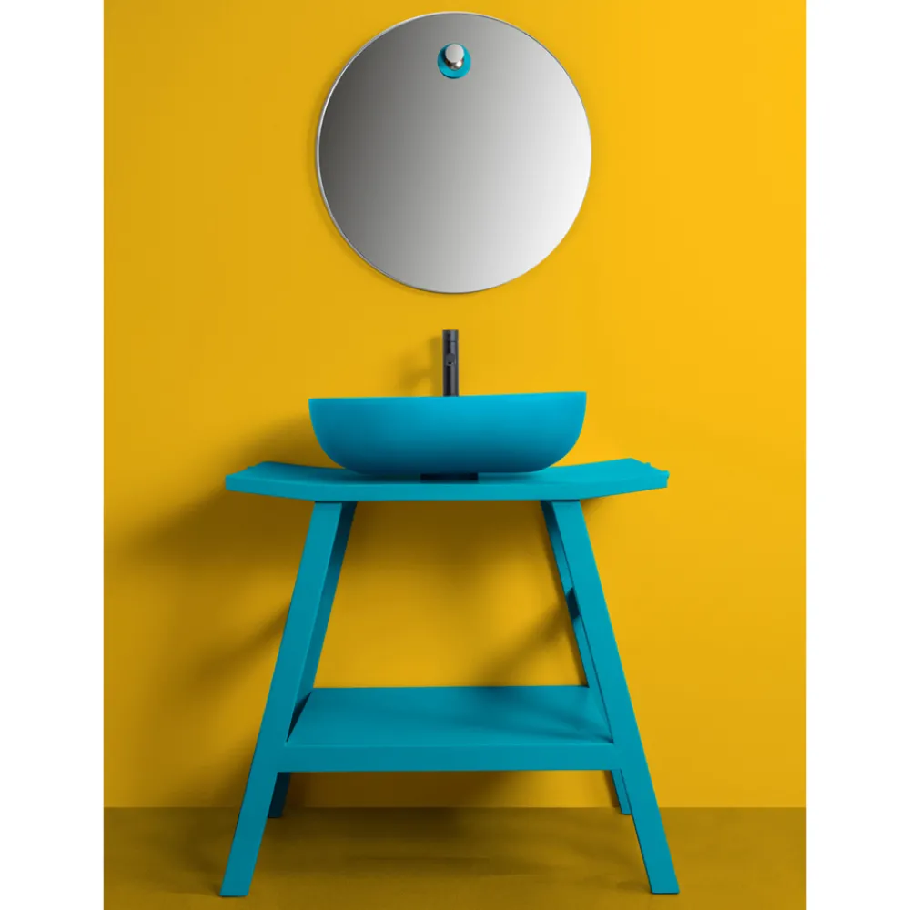 Freistehender Badezimmerschrank aus naturbelassenem blau lackiertem Teakholz , eine Farbe, die sich auf Ruhe und Gelassenheit bezieht und das Gefühl eines Eintauchens in das Blau des sardischen Meeres erzeugt, eine Emotion, die sich auf den überwältigenden Charme der Natur im Hinterland bezieht. Seine Struktur zeichnet sich durch die leicht geschwungene Form der Platte aus, die der Ästhetik des Produkts eine exklusive und raffinierte Note verleiht. Komplett mit 4 praktischen Handtuchhaken und funktionaler Ablagefläche .