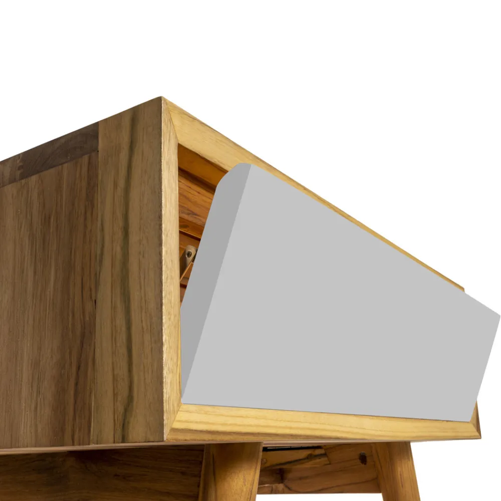 Bodenstehender Badezimmerschrank aus recyceltem natürlichem Teakholz mit Klappschublade aus grauem Mahagoniholz , der neutralen Farbe schlechthin, die aus der Verschmelzung von Weiß und Schwarz hervorgeht und sich aus diesem Grund ergänzt und Eleganz auf diskrete und zurückhaltende Weise ausdrückt. Seine Struktur zeichnet sich durch einfache Formen und praktische Räume aus, die sich ideal für die elegante und funktionale Organisation des Badezimmerbereichs eignen, um ein originelles Ergebnis mit einer starken modernen Persönlichkeit zu erzielen.