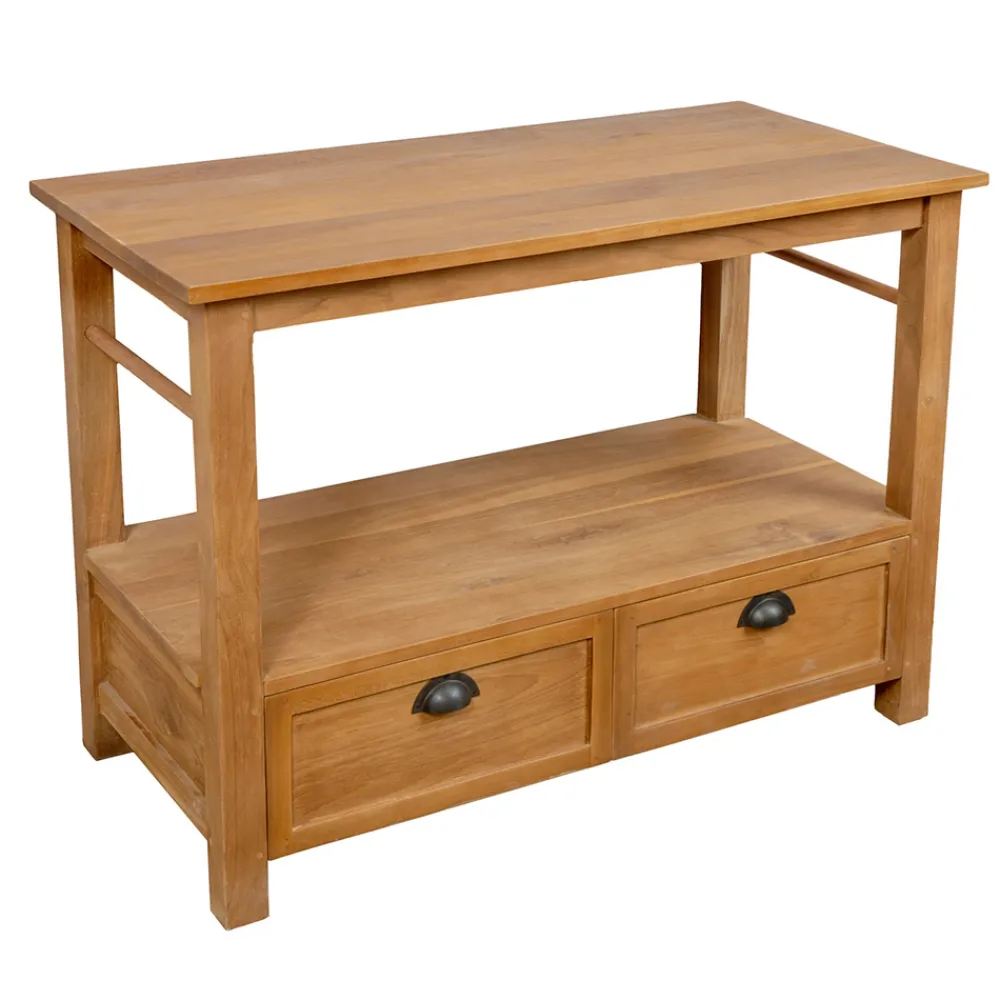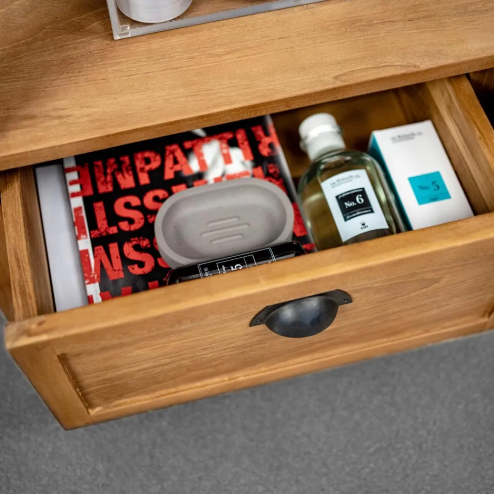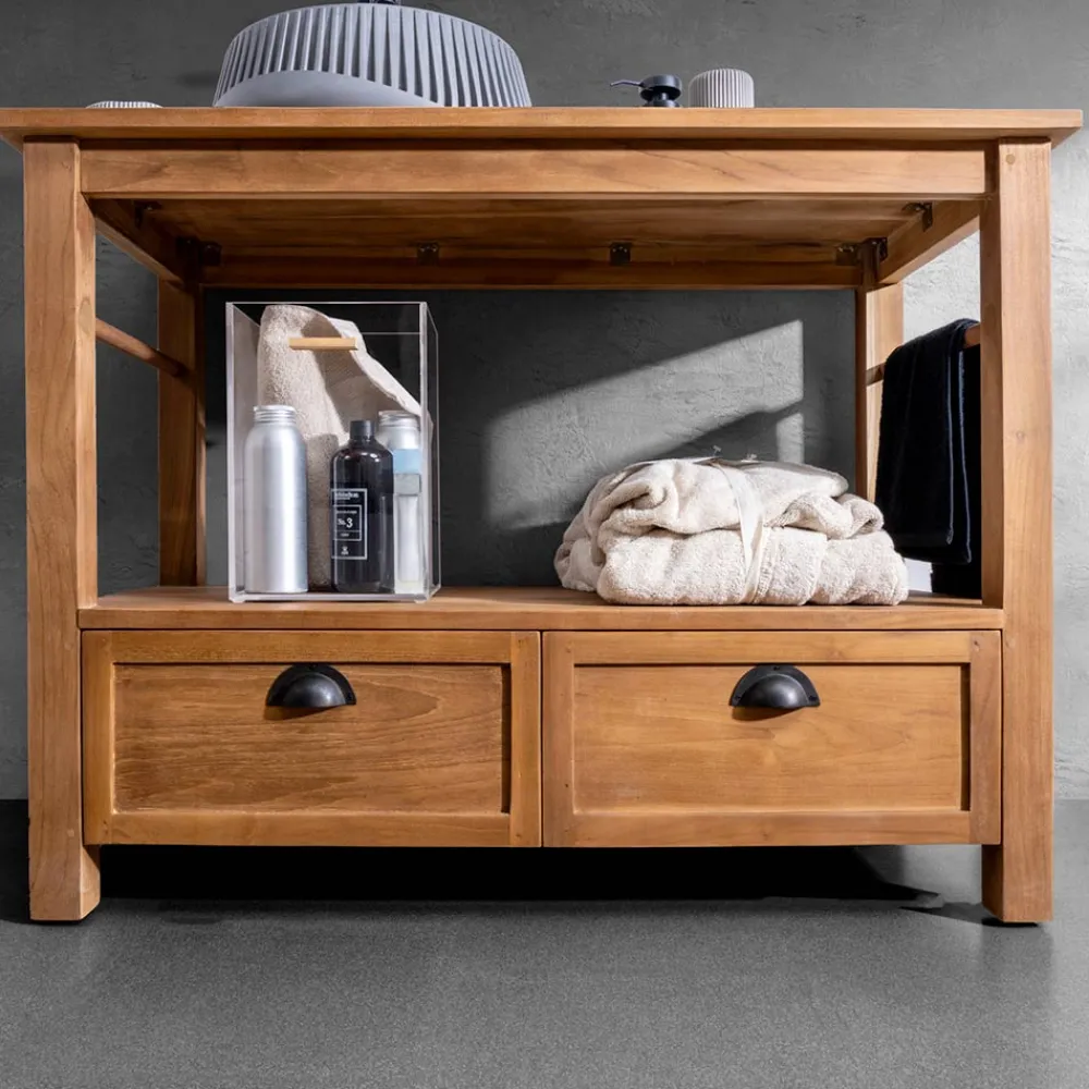 Dieser Badezimmerschrank ist ein elegantes Beispiel für Funktionalität und Stil und eignet sich ideal, um jeder Umgebung einen Hauch von Klasse zu verleihen. Dieses aus hochwertigem, massivem Altteakholz gefertigte Möbelstück ist nicht nur ästhetisch ansprechend, sondern dank seines 100 % natürlichen Materials, das sorgfältig gewachst wurde, um Festigkeit und Haltbarkeit zu gewährleisten, auch eine nachhaltige Option. Er verfügt über zwei geräumige Schubladen an der Unterseite, die jeweils mit Griffen im Vintage-Design verziert sind, die dem Schrank einen einzigartigen Charakter verleihen. Die unbestreitbare Funktionalität wird durch zwei an den Seiten des Möbels angebrachte Handtuchhalter vervollständigt.