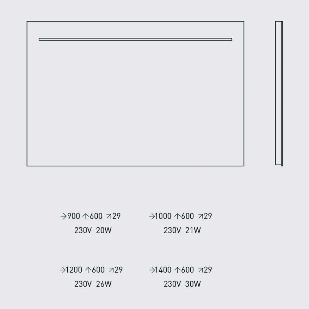 Rechteckiger Wandspiegel, handgefertigt in Italien mit hochwertigen Rohstoffen. Sie besteht aus einem Stahlrahmen und wird durch ein sandgestrahlten horizontales Band für den vorderen und oberen Ausgang des LED – Lichts aus, das über einen Berührungsschalter aktiviert werden kann.
