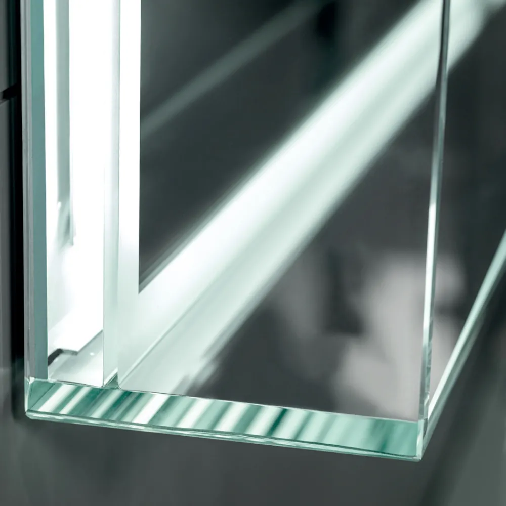 Spiegel mit einem transparenten, extraklaren Kristallrahmen, der im 45°-Winkel verklebt ist, und in den Spiegel integrierten Lichtern , vollständig in Italien hergestellt.
