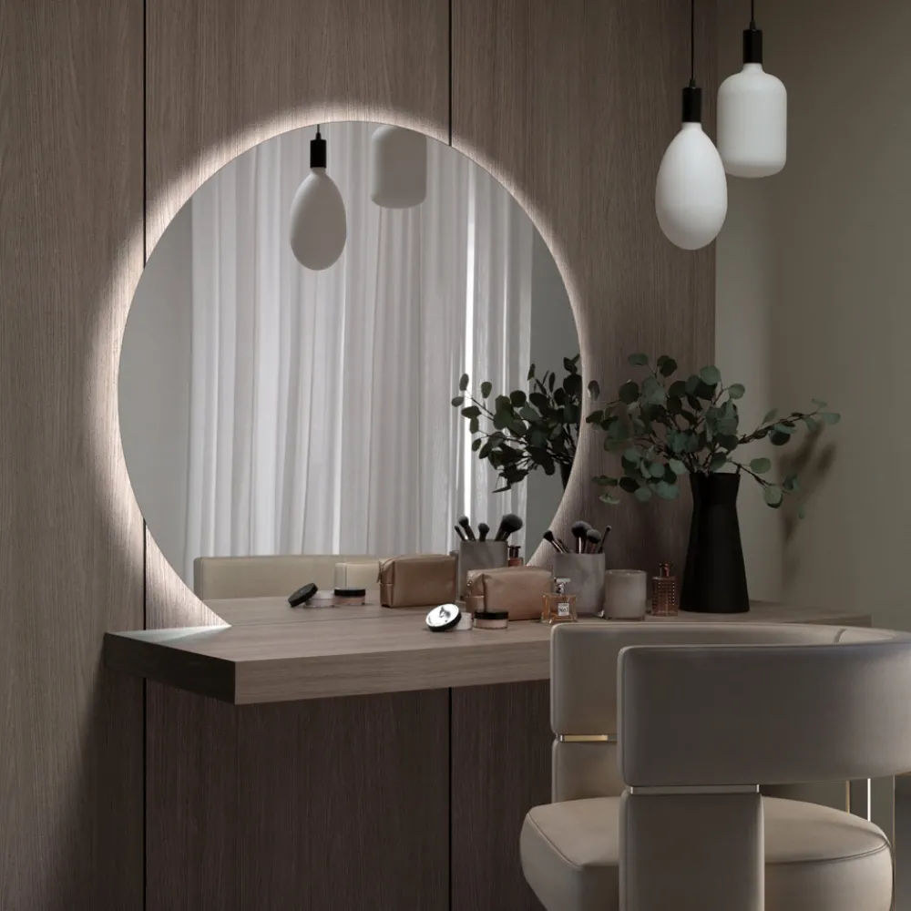 Dieser runde Spiegel ist ein Design-Meisterwerk, das Eleganz und Modernität verkörpert. Die seinem Profil entsprechende Hintergrundbeleuchtung sorgt für einen ätherischen Glanz und ein sanftes Licht, das jede Umgebung aufwertet und eine intime und raffinierte Atmosphäre schafft. Die runde Form des Spiegels, eine zeitlose Stilwahl, reflektiert und verstärkt das natürliche Licht und die Schönheit des umgebenden Raums. Dieser hinterleuchtete Spiegel eignet sich perfekt für den Eingangsbereich, das Badezimmer oder als Blickfang im Wohnzimmer und ist nicht nur ein reflektierendes Element, sondern ein echtes Einrichtungsobjekt, das Form und Funktion, Schönheit und Helligkeit zu einem Ergebnis puren Stils und Atmosphäre vereint .