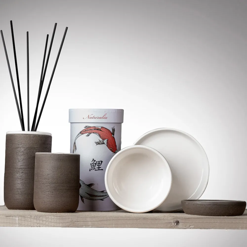 Das runde Behältertablett und die Schale eignen sich perfekt als Ablage für verschiedene Gegenstände, während der Baumwollhalter auch als Schmuckkästchen verwendet werden kann . Die Toilettenbürste hat einen mattschwarzen Metallgriff und einen emaillierten Deckel, während die runde Seifenschale aus zwei Teilen besteht, die den Sockel aus Schamott und die emaillierte Untertasse umfassen. Das Innere des Diffusors bietet Platz für eine 250-ml-Flasche.