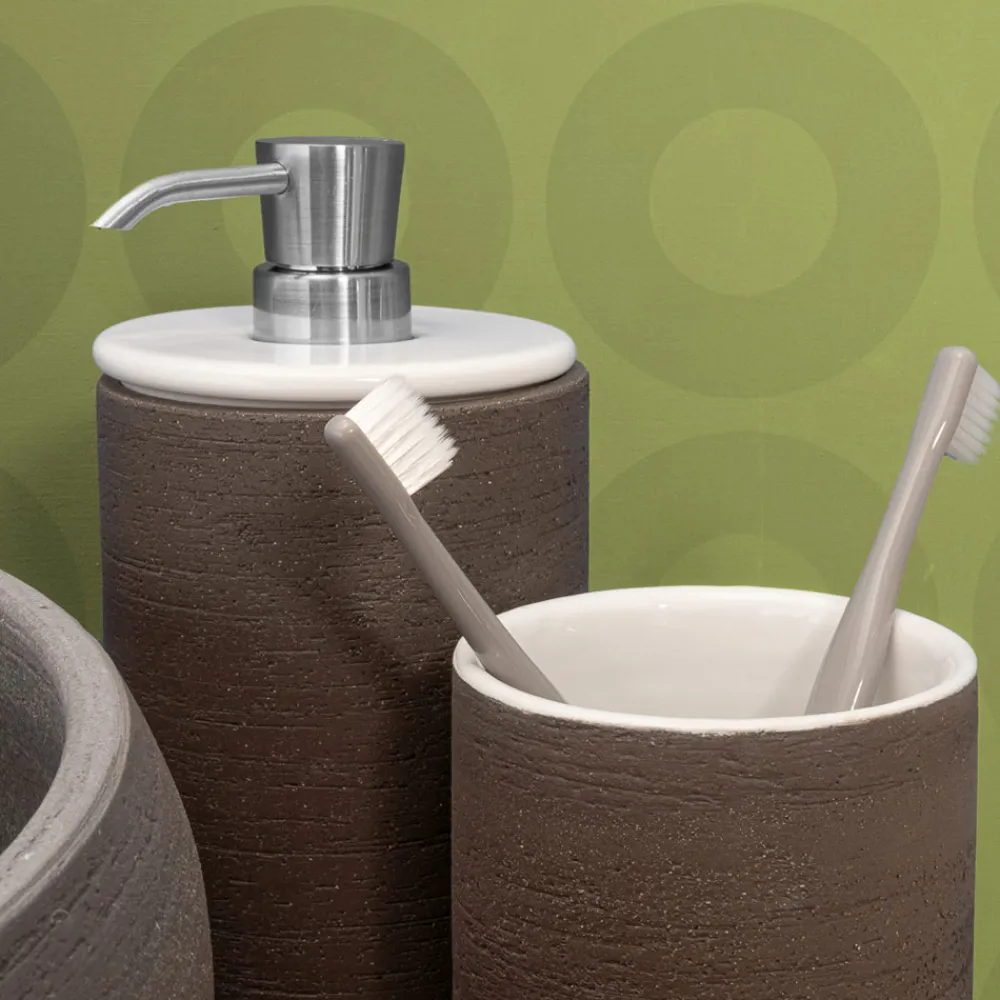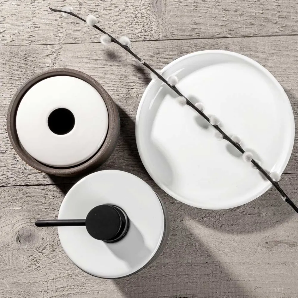 Freistehende Badaccessoires aus feuerfestem Ton und dunkler Erde , handgefertigt in Italien, innen weiß glasiert, eine Farbe, die an das Weiß des Schnees und die Helligkeit der Natur in ihrer reinsten Form erinnert. Jedes Element der Komposition zeichnet sich durch besondere Details aus, wie das Neoprenpolster auf der Basis des Zubehörs, um den Schutz der Auflageflächen zu gewährleisten, und der Spender mit Pumpe aus mattschwarzem Metall, um eine optimale Abgabe der Seife zu gewährleisten. Die Arbeitsplatten-Accessoires sind elegant und faszinierend, besonders funktional mit einzigartigen Reflexionen, die exklusive Atmosphären schaffen.