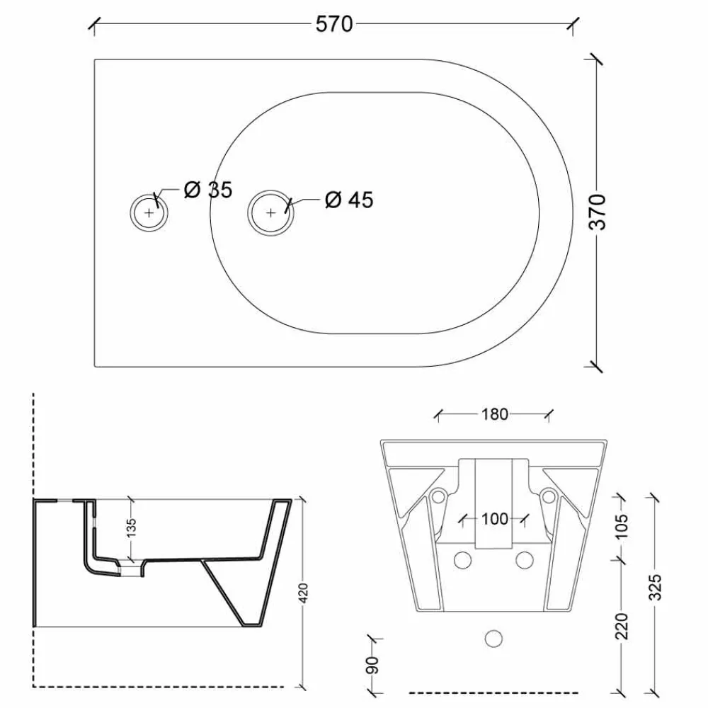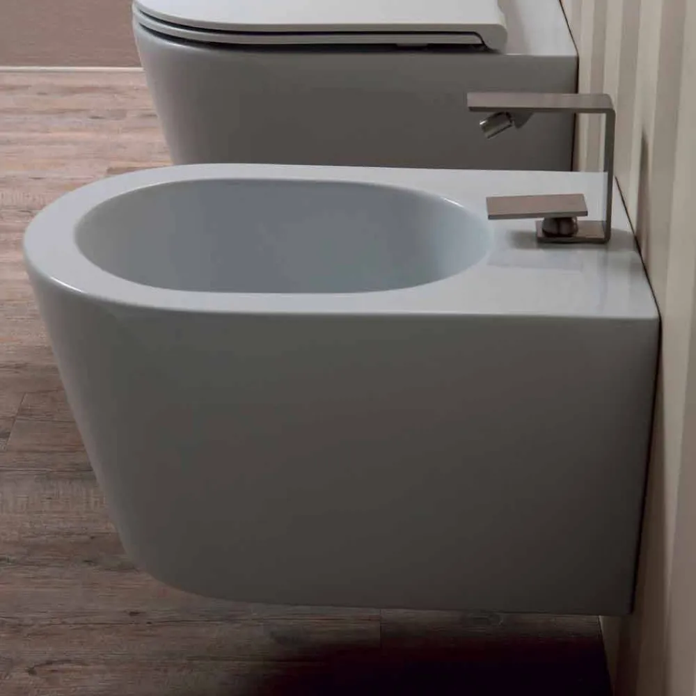 Wandhängendes Keramik-Bidet mit Befestigungsbügeln und Schnellbefestigung inklusive.