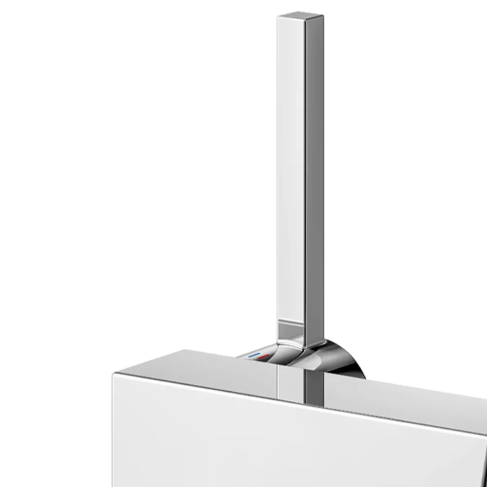 Es ist eine Armatur mit klaren und essentiellen geometrischen Linien aus verchromtem Messing mit hochwertigen Materialien.