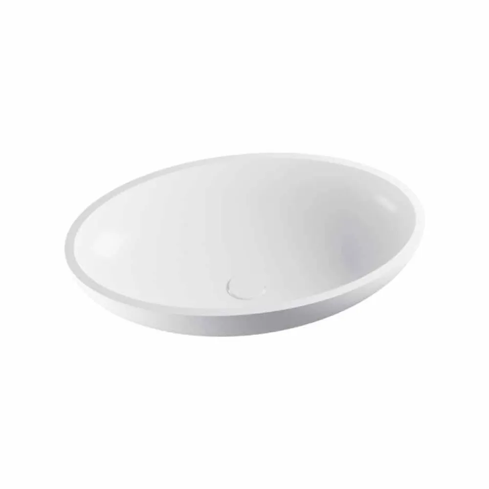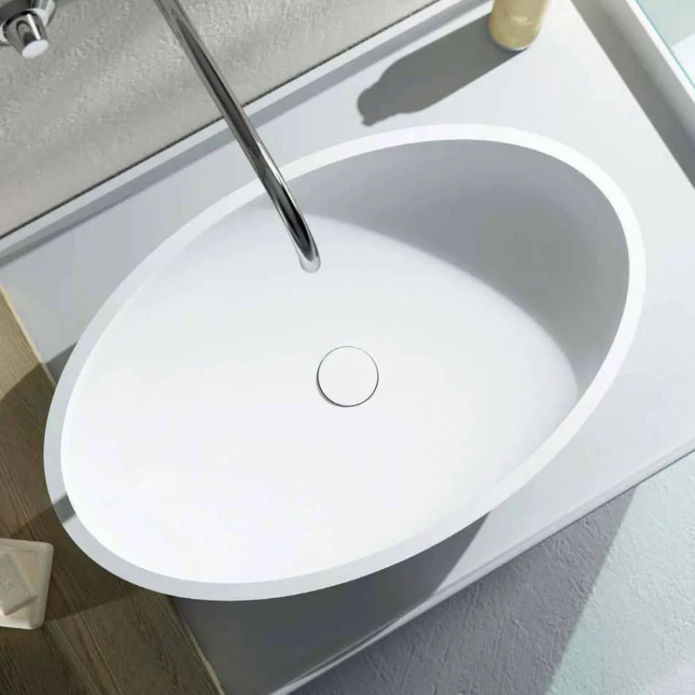 Frascati ist ein freistehendes freistehendes Waschbecken aus Solid Surface mit einer ovalen Pflanze.