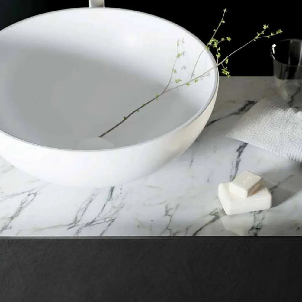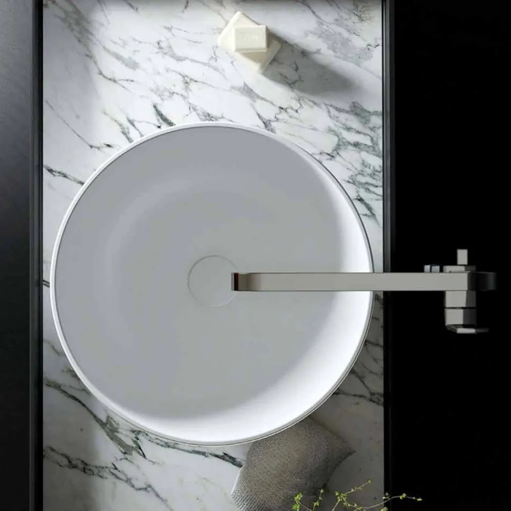 Donnas ist ein freistehendes freistehendes Waschbecken aus Solid Surface mit rundem Grundriss.