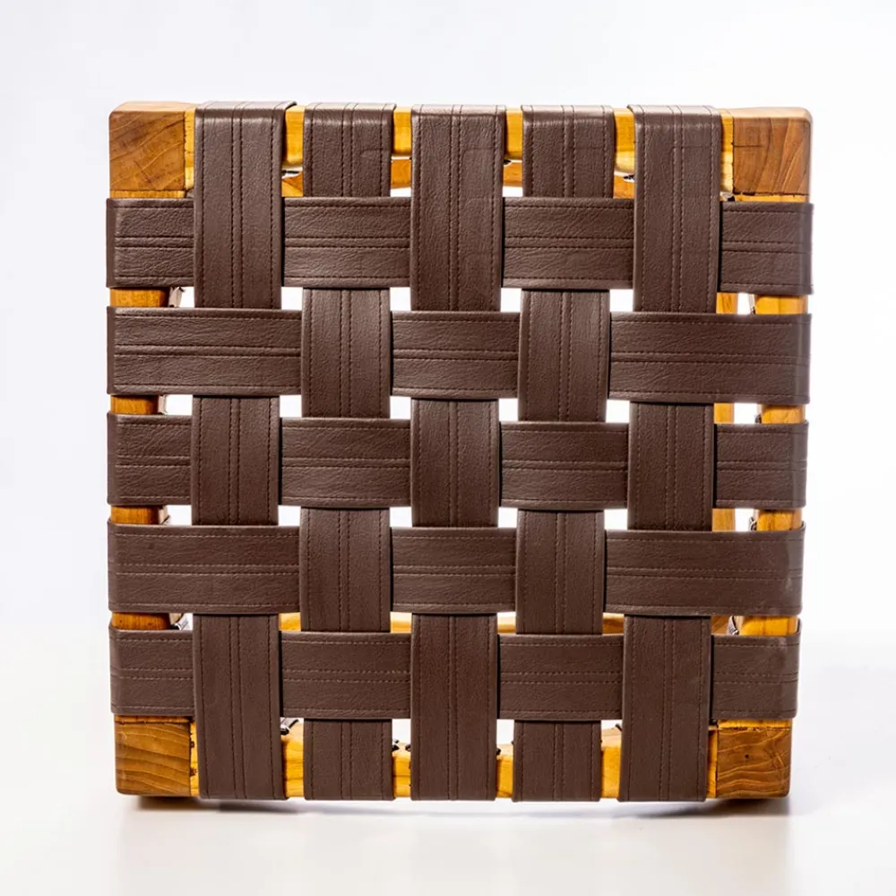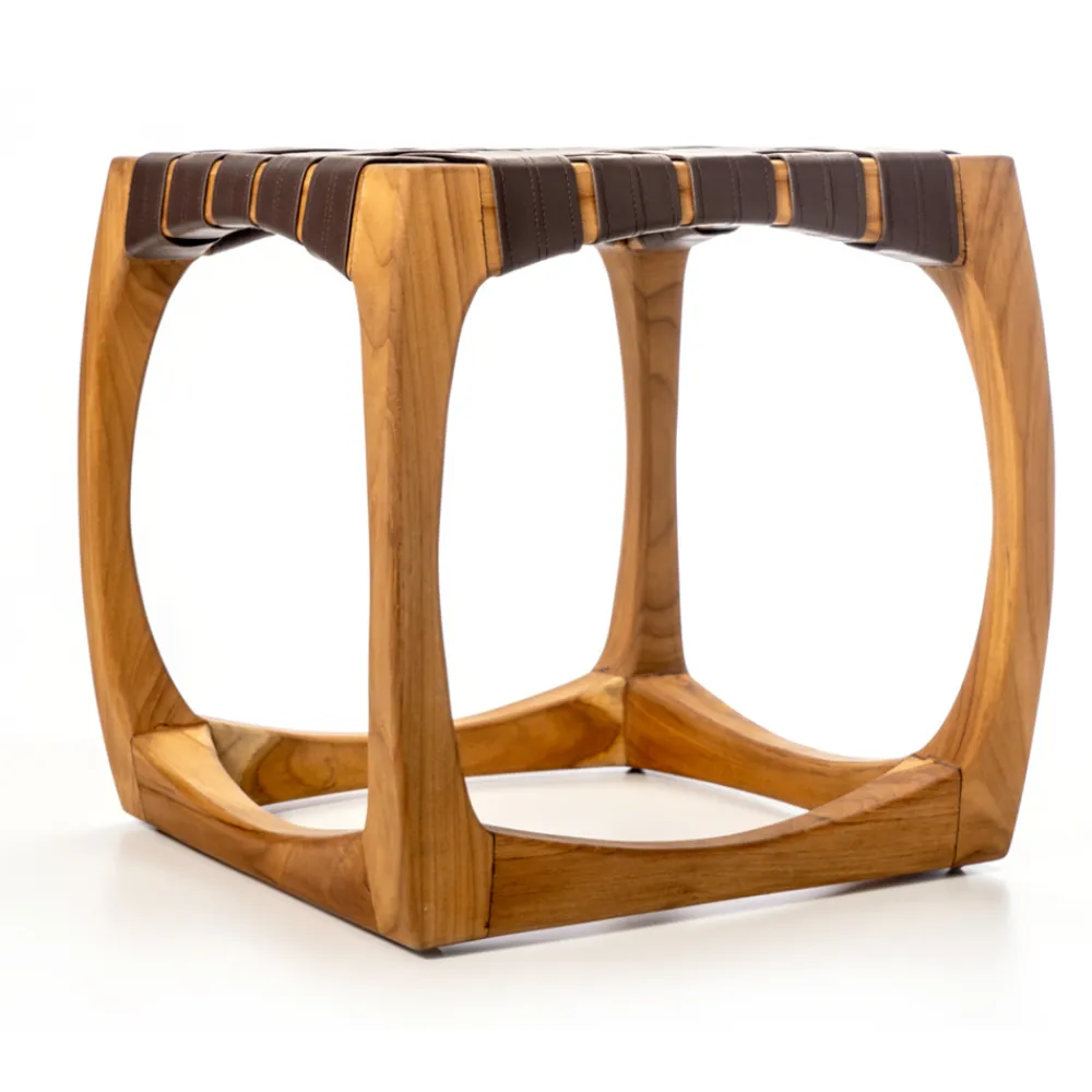 Dieser Badezimmerhocker ist ein wahres Meisterwerk an Design und Funktionalität. Seine geschwungene Struktur aus massivem Teakholz zeugt von handwerklichem Können und bietet unvergleichliche Stabilität, während das Ledergeflecht der Sitzfläche nicht nur einen Hauch von Eleganz verleiht, sondern auch für einen bequemen Sitz sorgt. Mit seinen großzügigen Abmessungen dient dieser Hocker nicht nur als Sitzgelegenheit, sondern auch als Ablagefläche für persönliche Gegenstände wie Kosmetikkoffer oder Badaccessoires. Es ist ein vielseitiges Stück, das perfekt in jedes Badezimmer passt und Funktionalität und tadellosen Stil vereint.
