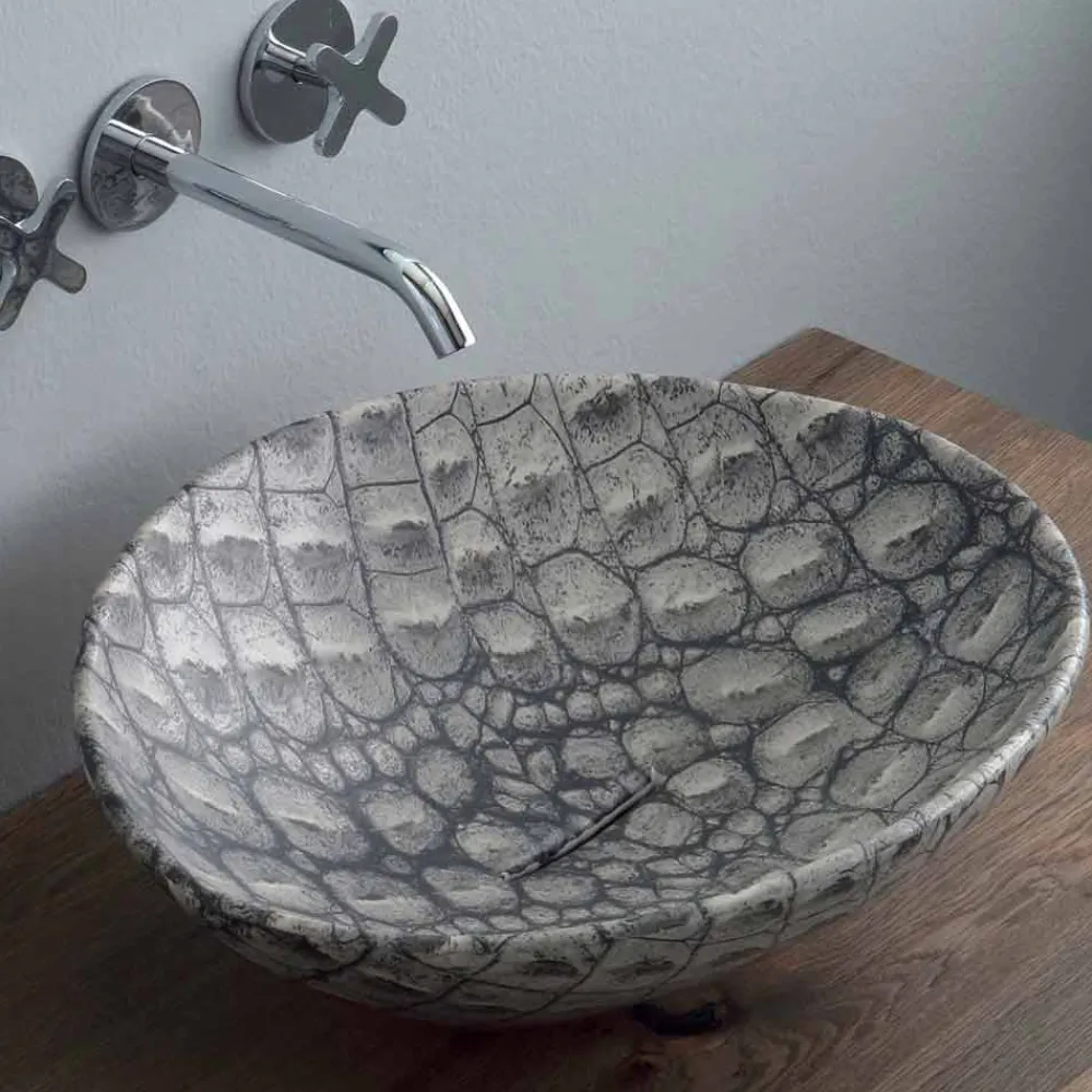 Animals ist ein unregelmäßig geformtes Aufsatzwaschbecken aus Keramik mit durchgehendem Wasserablauf.
