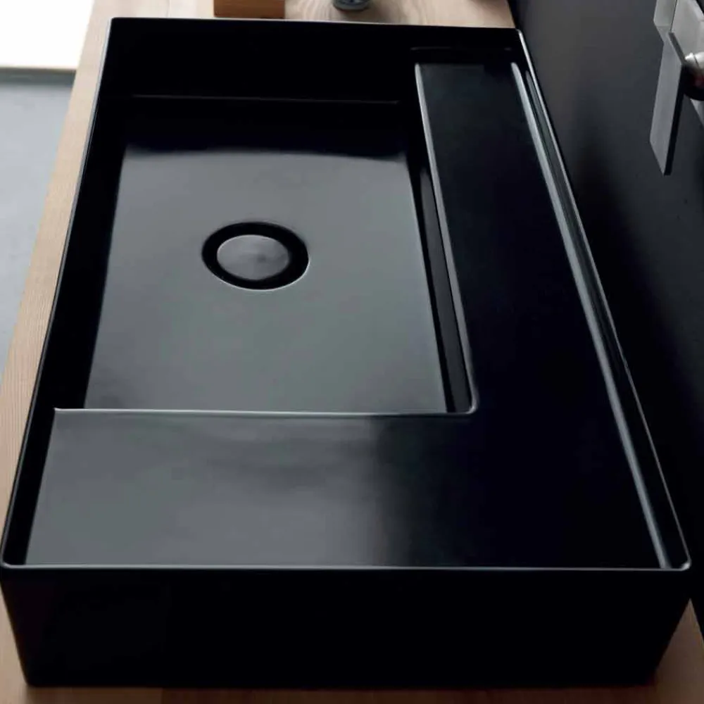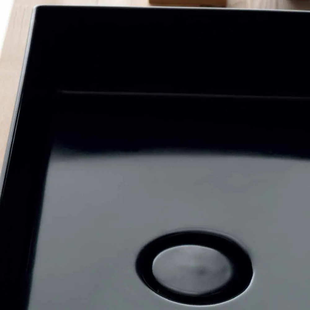 Waschbecken aus mattschwarzer Keramik im modernen Stil, ohne Hahnloch erhältlich.