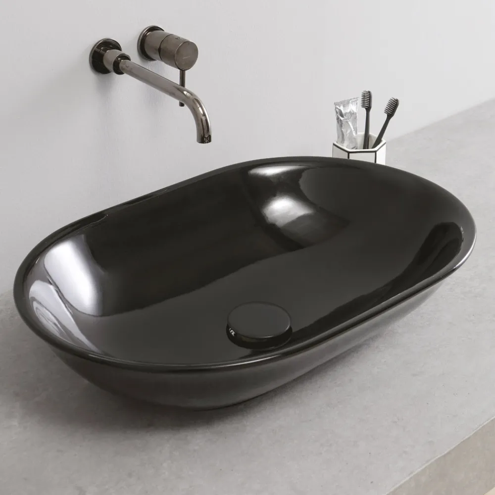 Aufsatzwaschbecken mit ovaler Form aus farbiger Keramik mit glänzender Oberfläche, hergestellt zu 100 % in handwerklicher Produktion Made in Italy . Weiche und harmonische Linien prägen das Design dieses edlen Waschbeckens mit einer schlichten und vielseitigen Ästhetik . Tatsächlich passt sich seine Form jedem modernen stilistischen Kontext perfekt an und bringt eine exklusive Note mit , die die Einrichtung des Badezimmerbereichs auf einzigartige und avantgardistische Weise vervollständigen kann. Um die Ästhetik des Waschbeckens zu bereichern, werden die wunderbaren Farben vorgeschlagen, die trotz eines nüchternen und eleganten Stils ein raffiniertes Ergebnis gewährleisten.